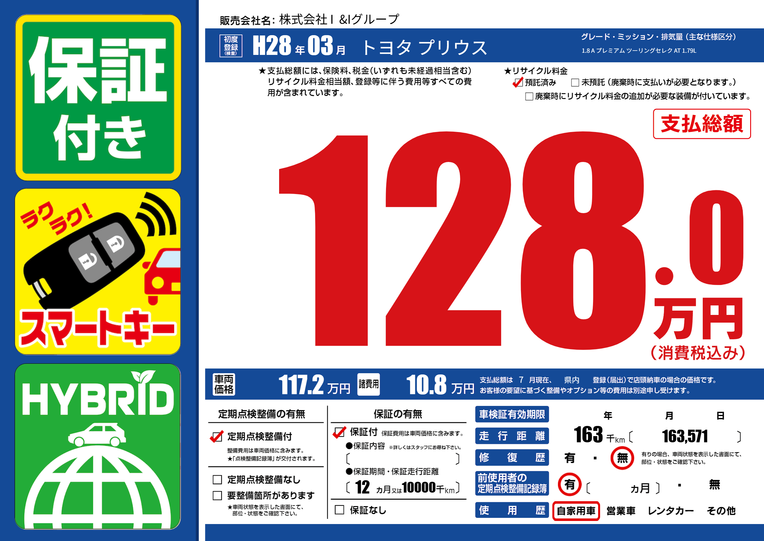 | 車名 | トヨタ プリウス | グレード ミッション 排気量 |