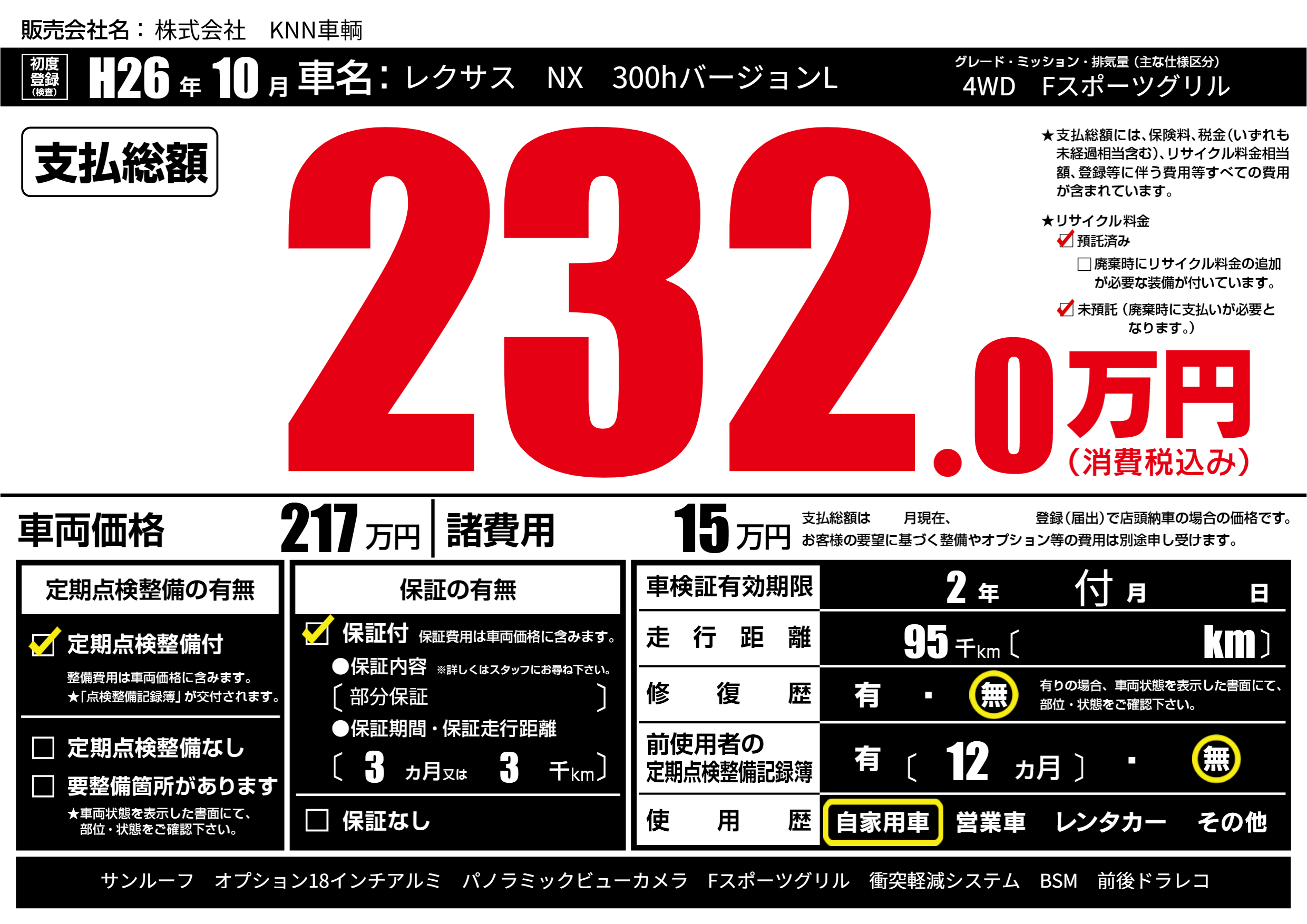 | 車名 | レクサス NX 300hバージョンL | グレード ミッション 排気量 |