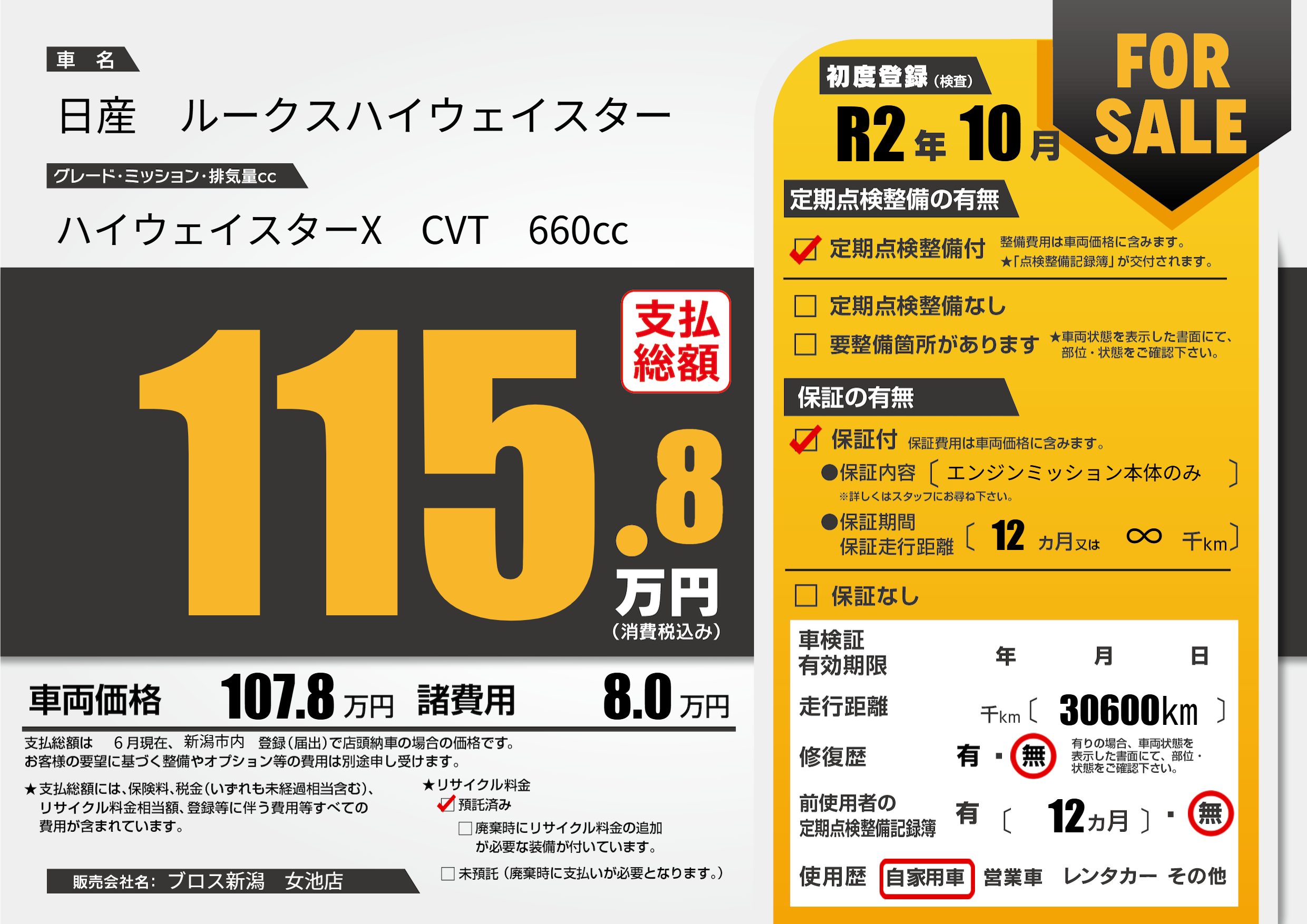 | 走行キロ | - | 初年度登録 | R2年10月 |