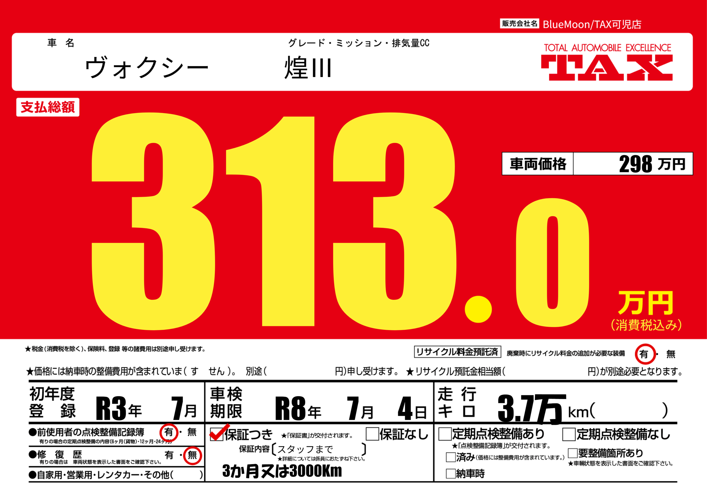 | 走行キロ | 0.3万km | 初年度登録 | R3年7月 |