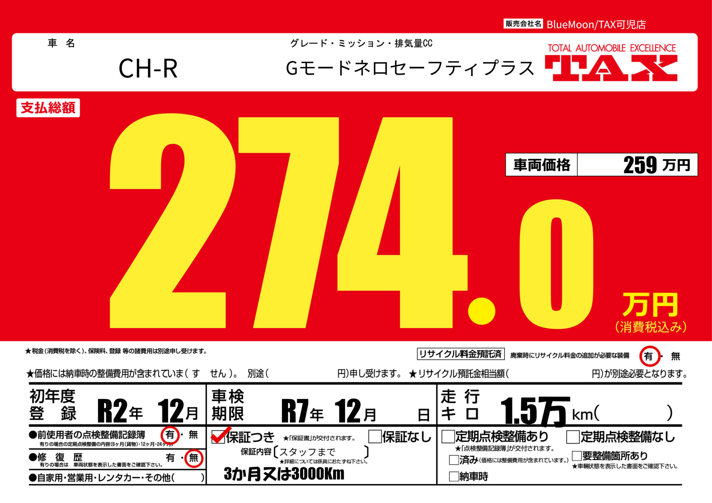 保証付き 保証内容(スタッフまで) ヶ月または千km |