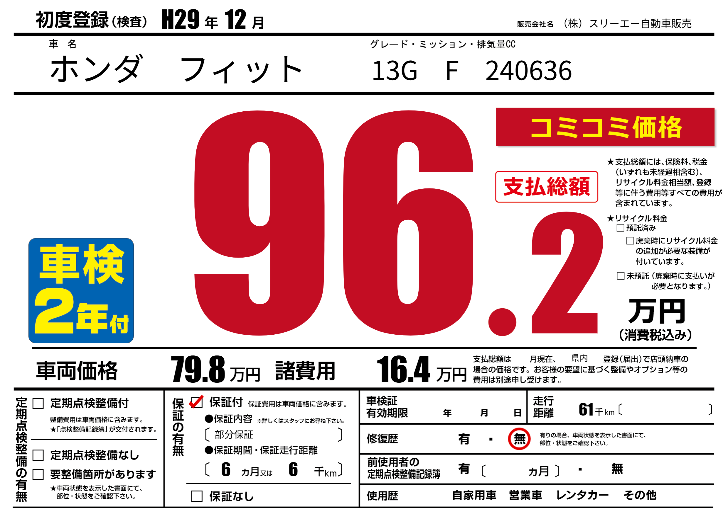 保証付き 保証内容(部分保証) 6ヶ月または(6)千kmまで |