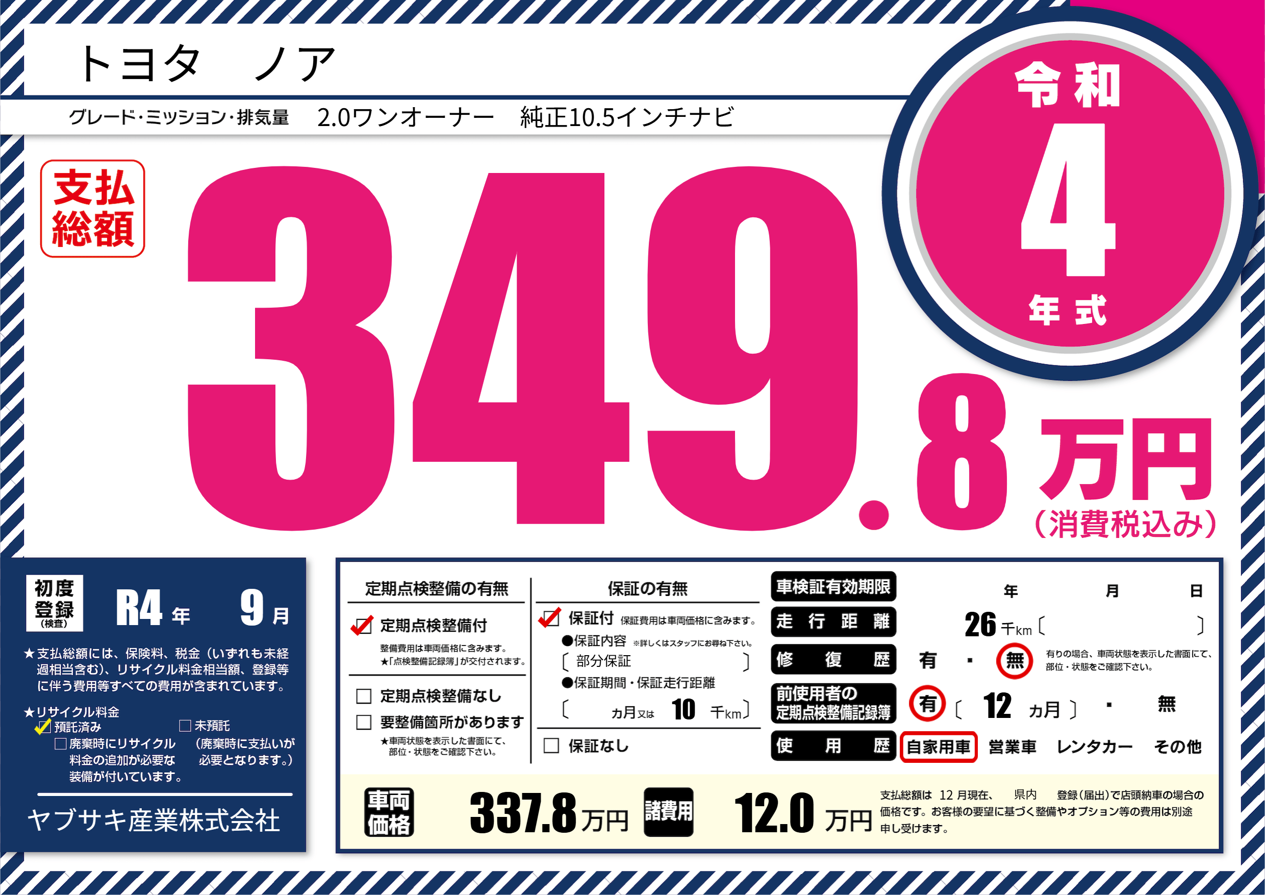 | 車名 | トヨタ ノア | グレード ミッション 排気量 |