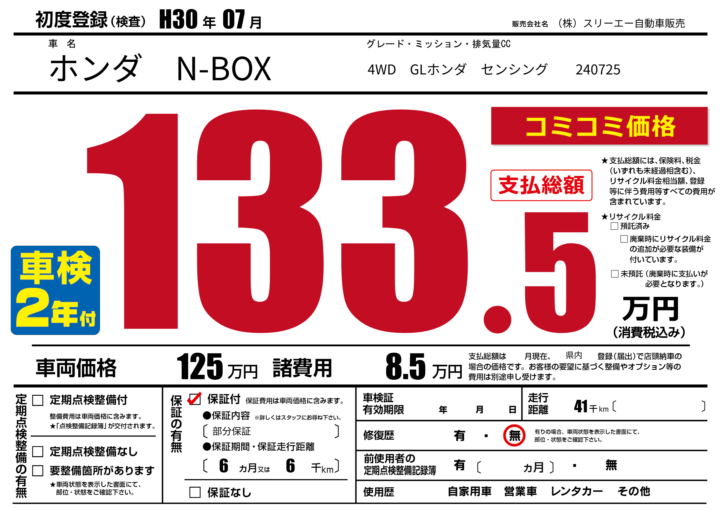 | 車名 | ホンダ N-BOX | グレード ミッション 排気量 |
