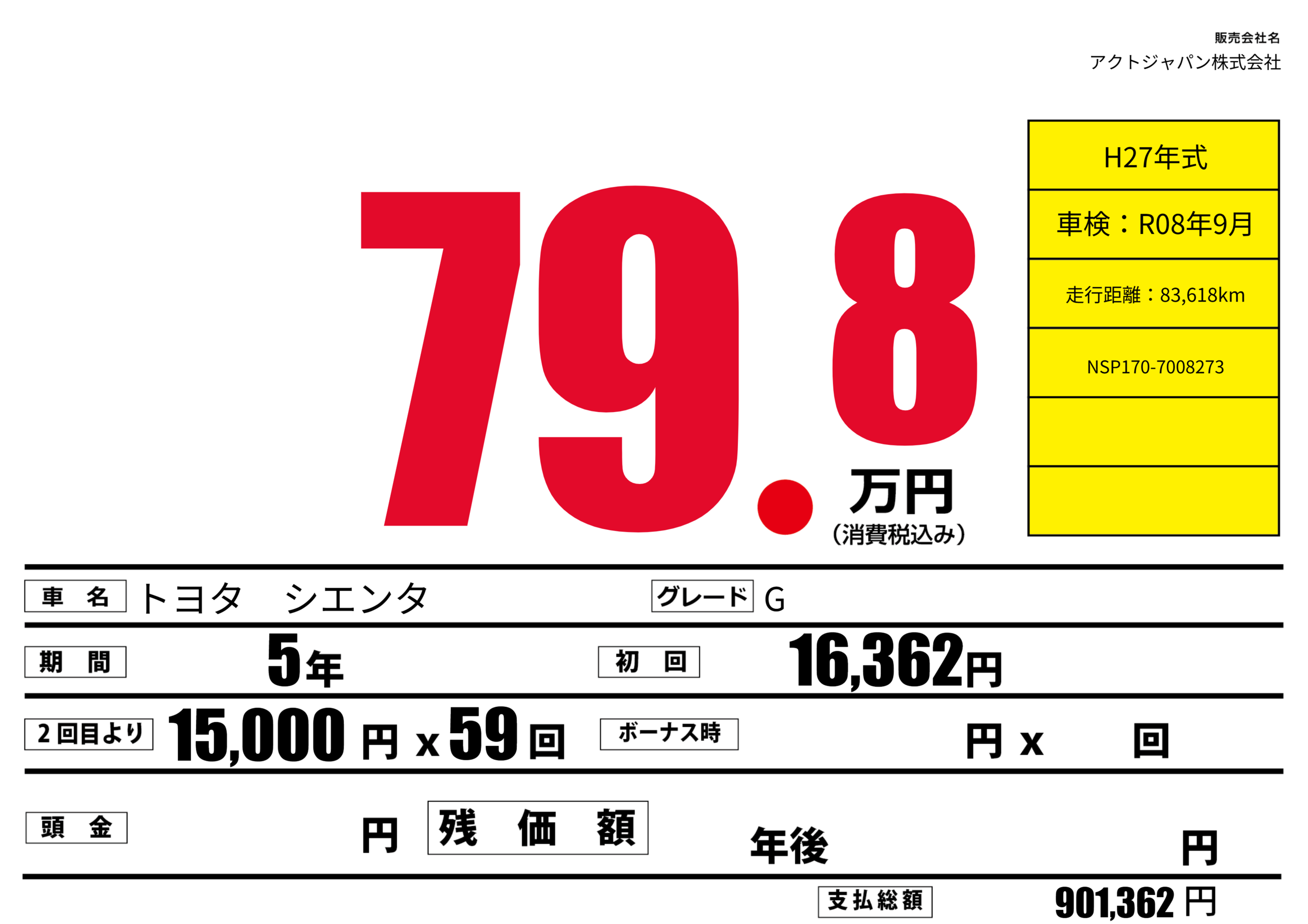 | 車名 | トヨタ シエンタ | グレード ミッション 排気量 |