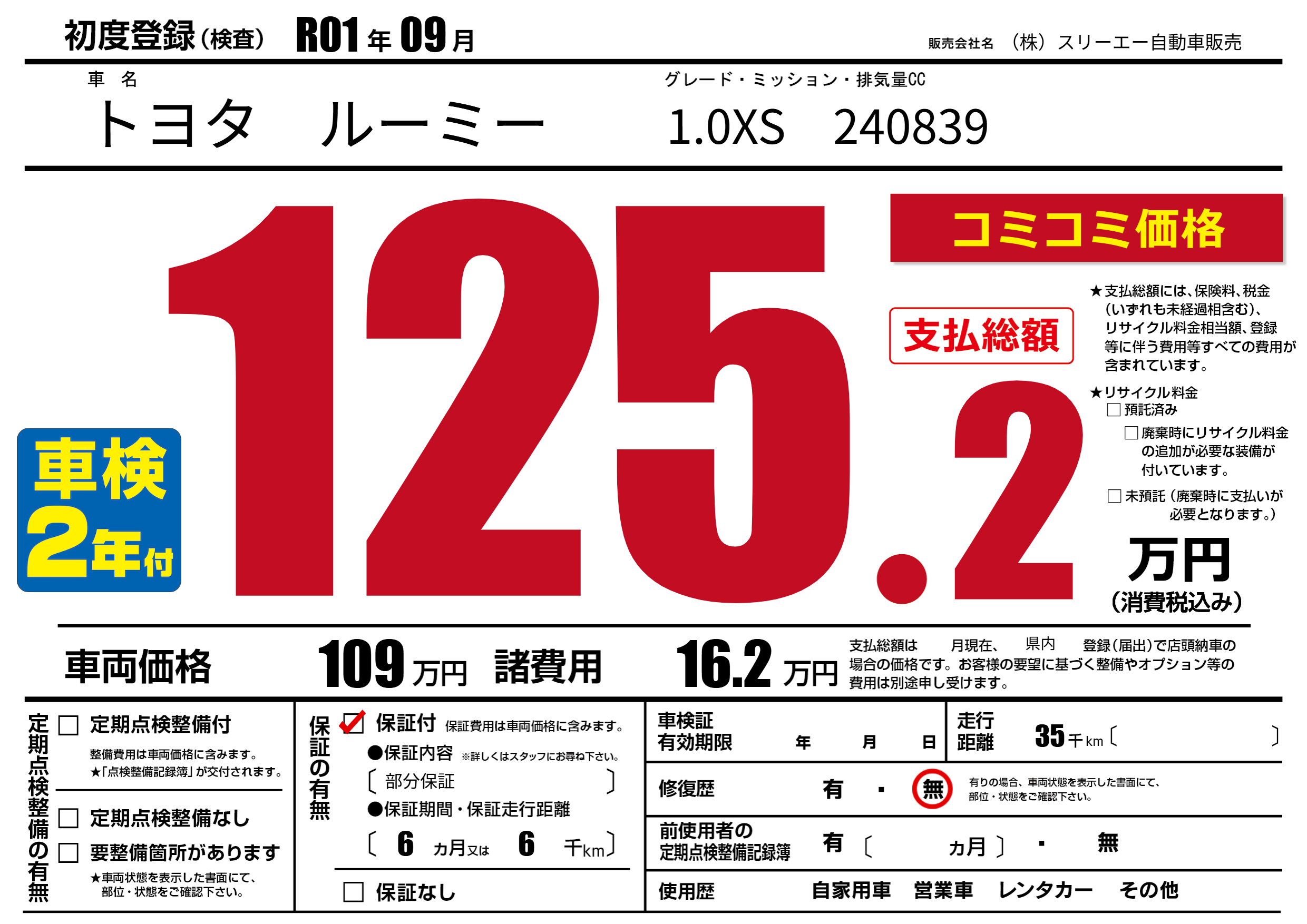| 車名 | トヨタ ルーミー | グレード ミッション 排気量 |