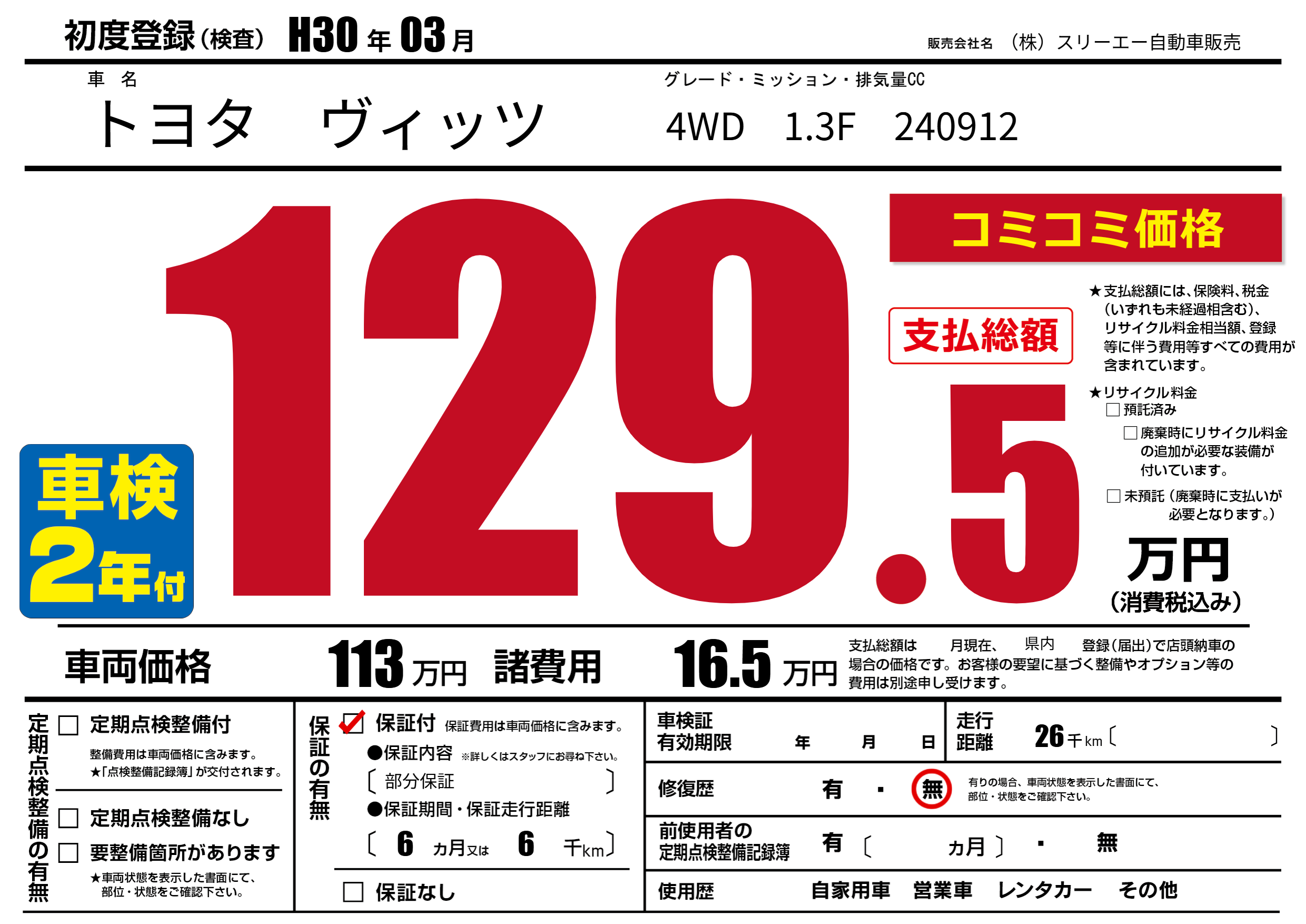 保証付き 保証内容(部分保証) 6ヶ月または(6)千kmまで |
