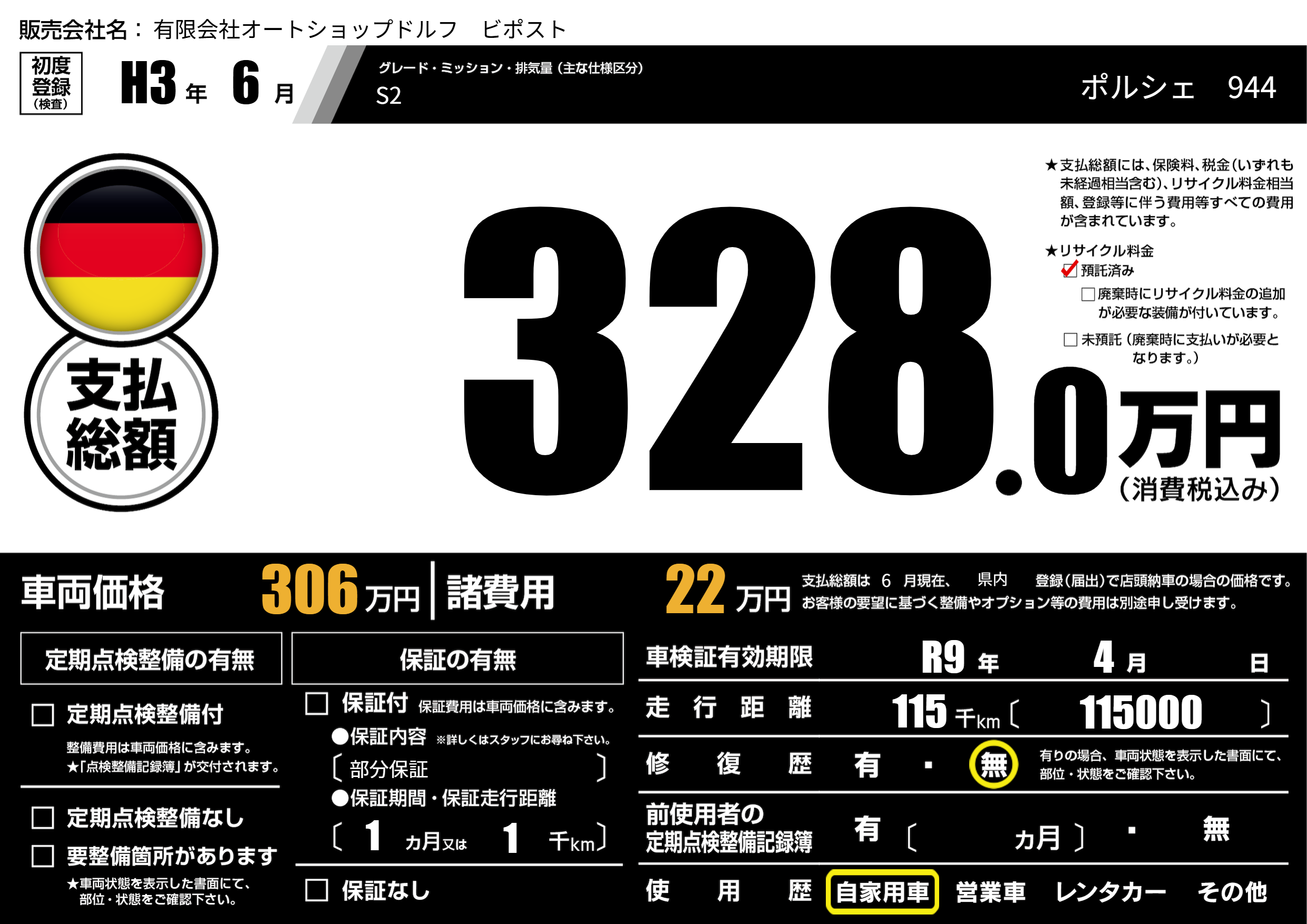 | 車名 | ポルシェ 944 | グレード ミッション 排気量 |