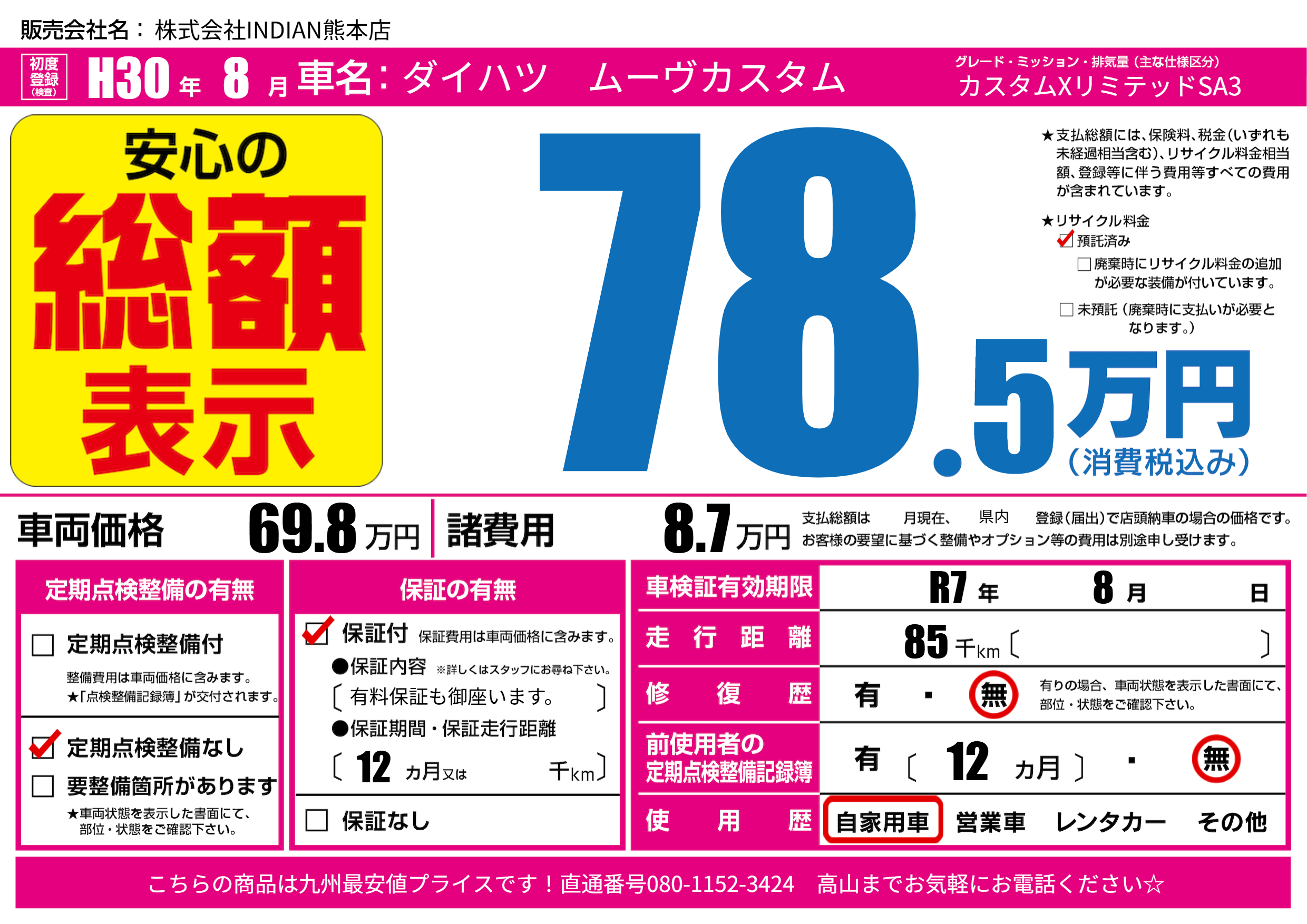 なし | 車検制限 | R7年8月---月 |