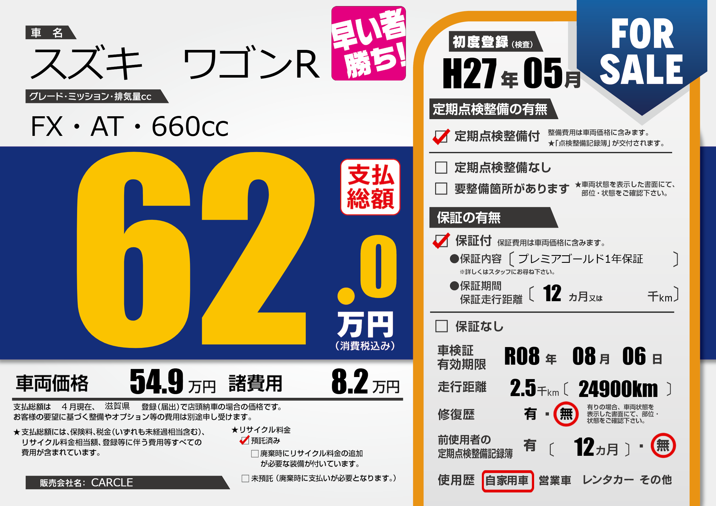 | 車名 | スズキ ワゴンR | グレード ミッション 排気量 |