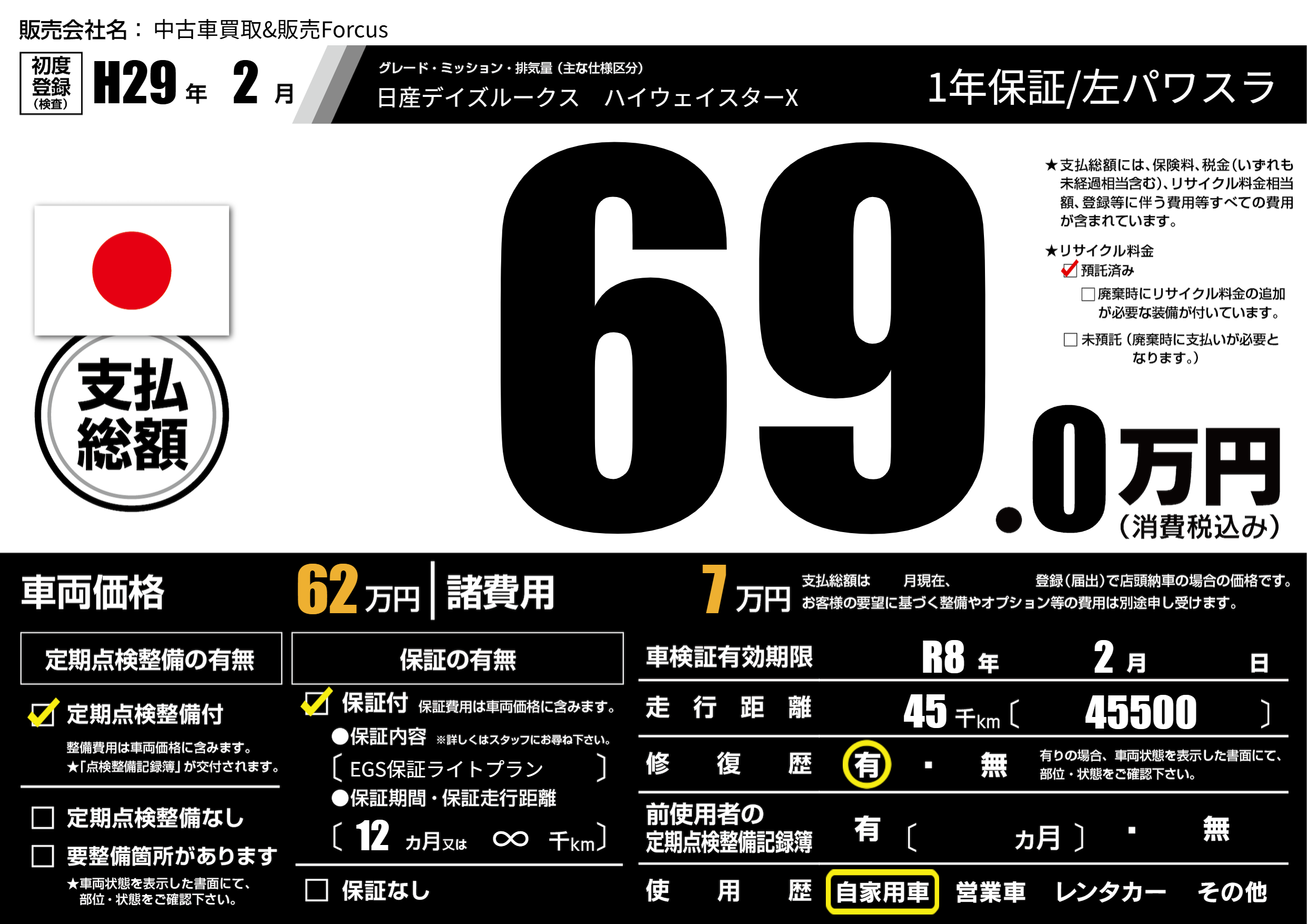 | 走行キロ | 4.5万km | 初年度登録 | H29年2月 |
