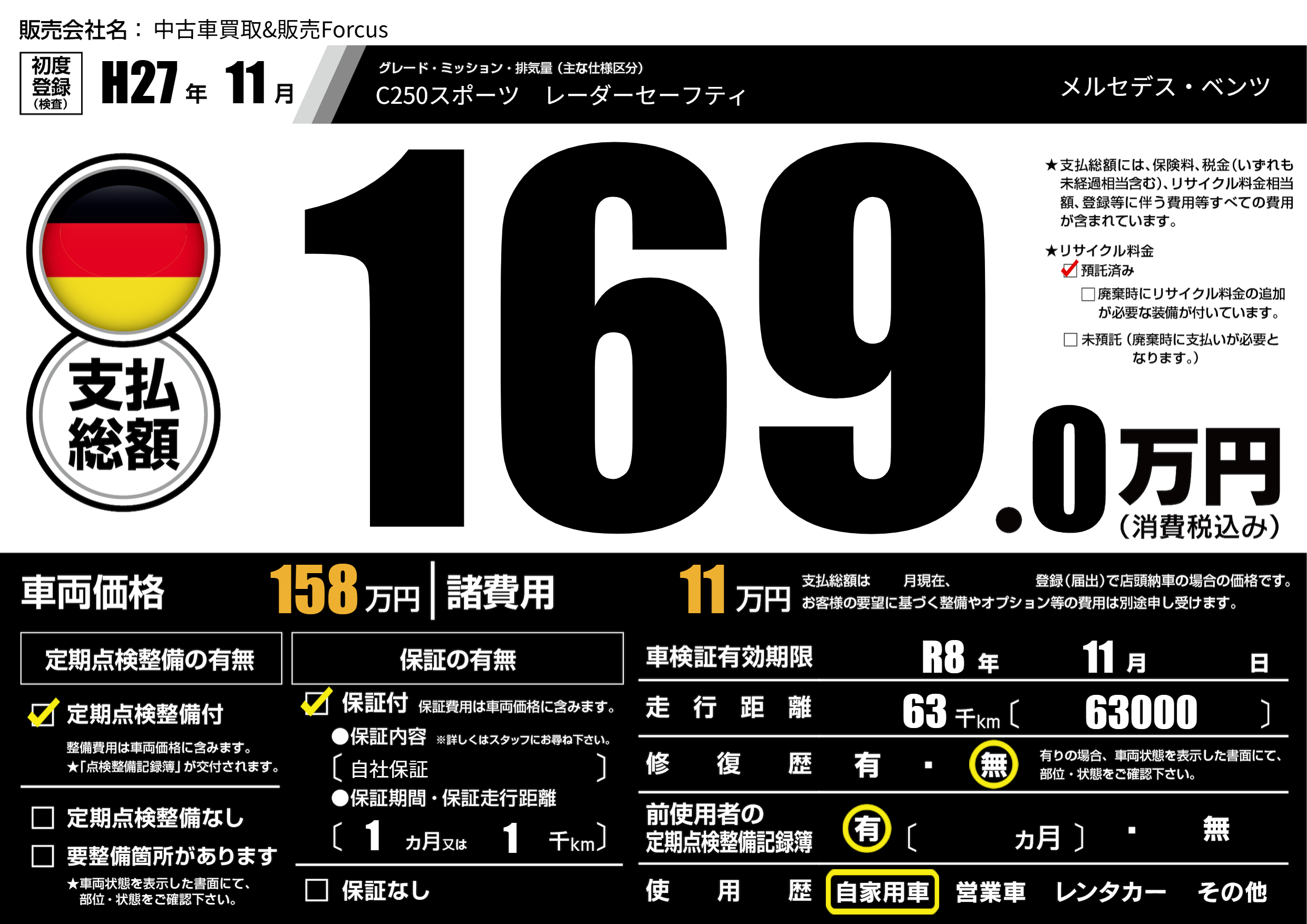 | 車名 | メルセデス・ベンツ | グレード ミッション 排気量 |