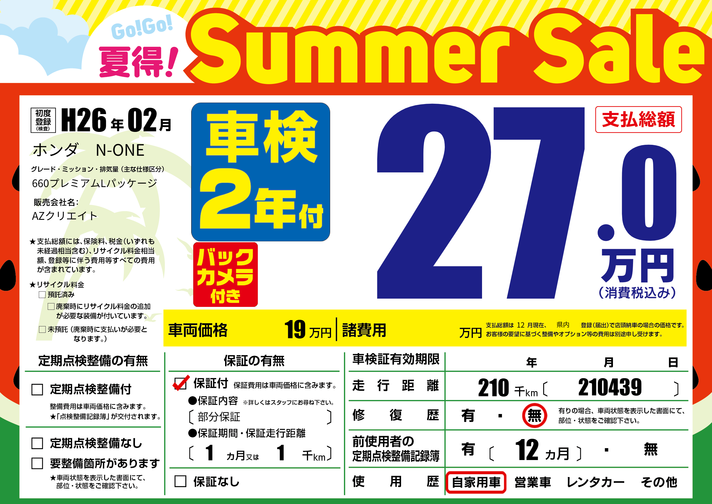 | 車名 | ホンダ N-ONE | グレード ミッション 排気量 |