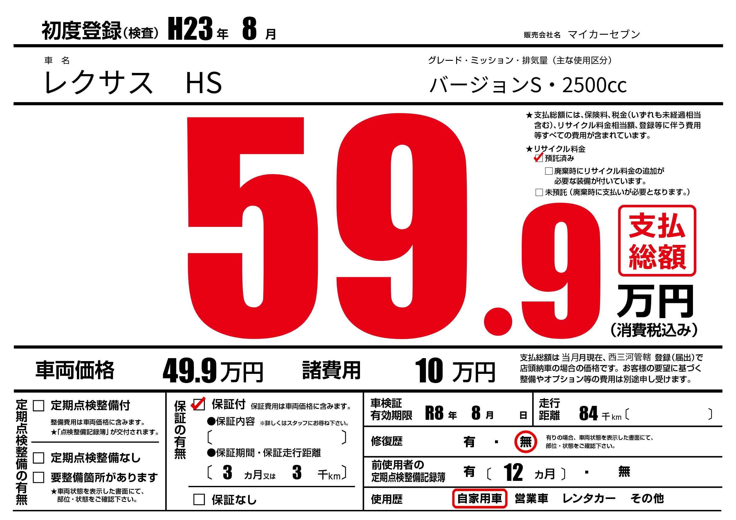 なし | 車検制限 | R8年8月---月 |