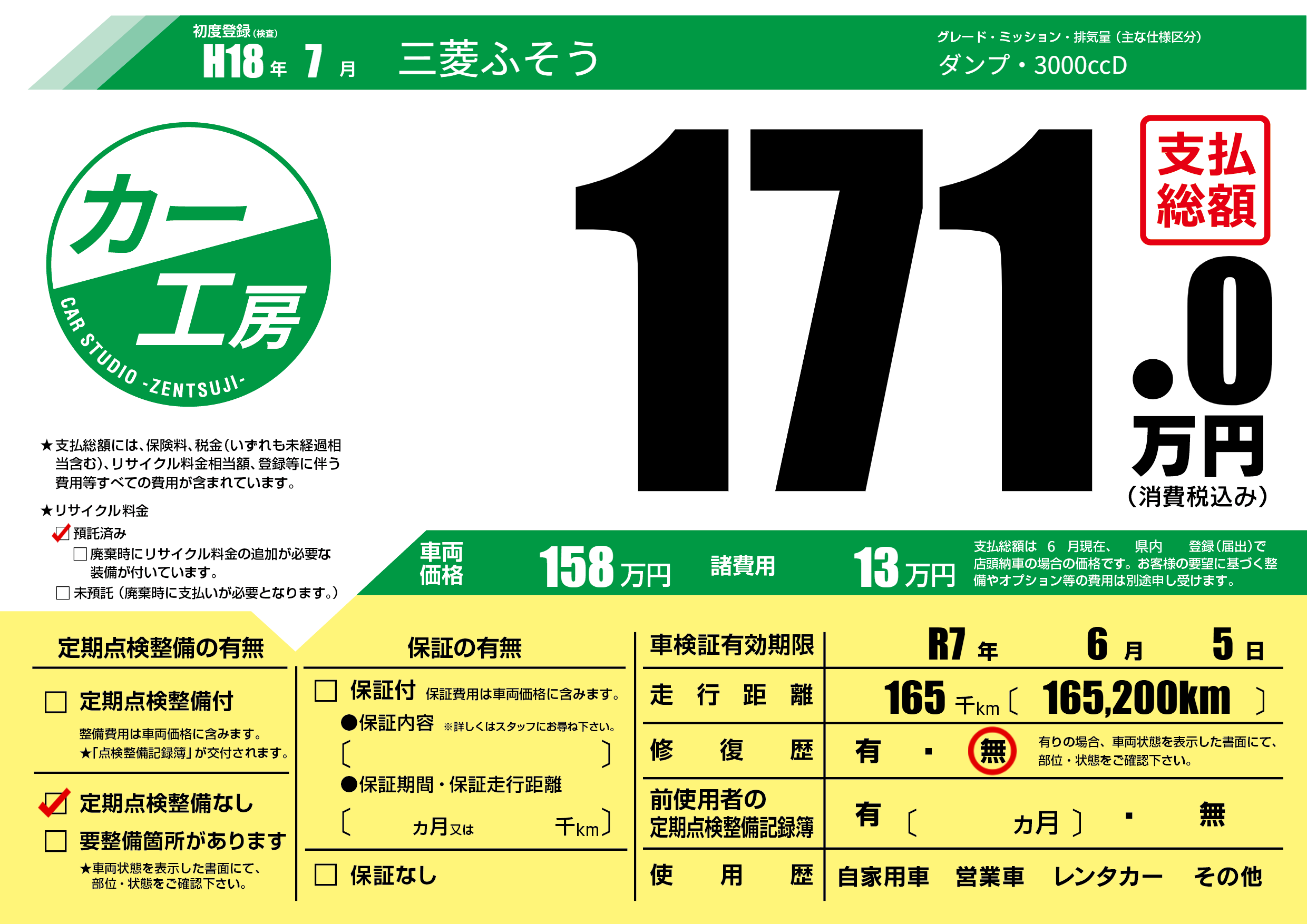 | 走行キロ | 16.5万km | 初年度登録 | H18年7月 |