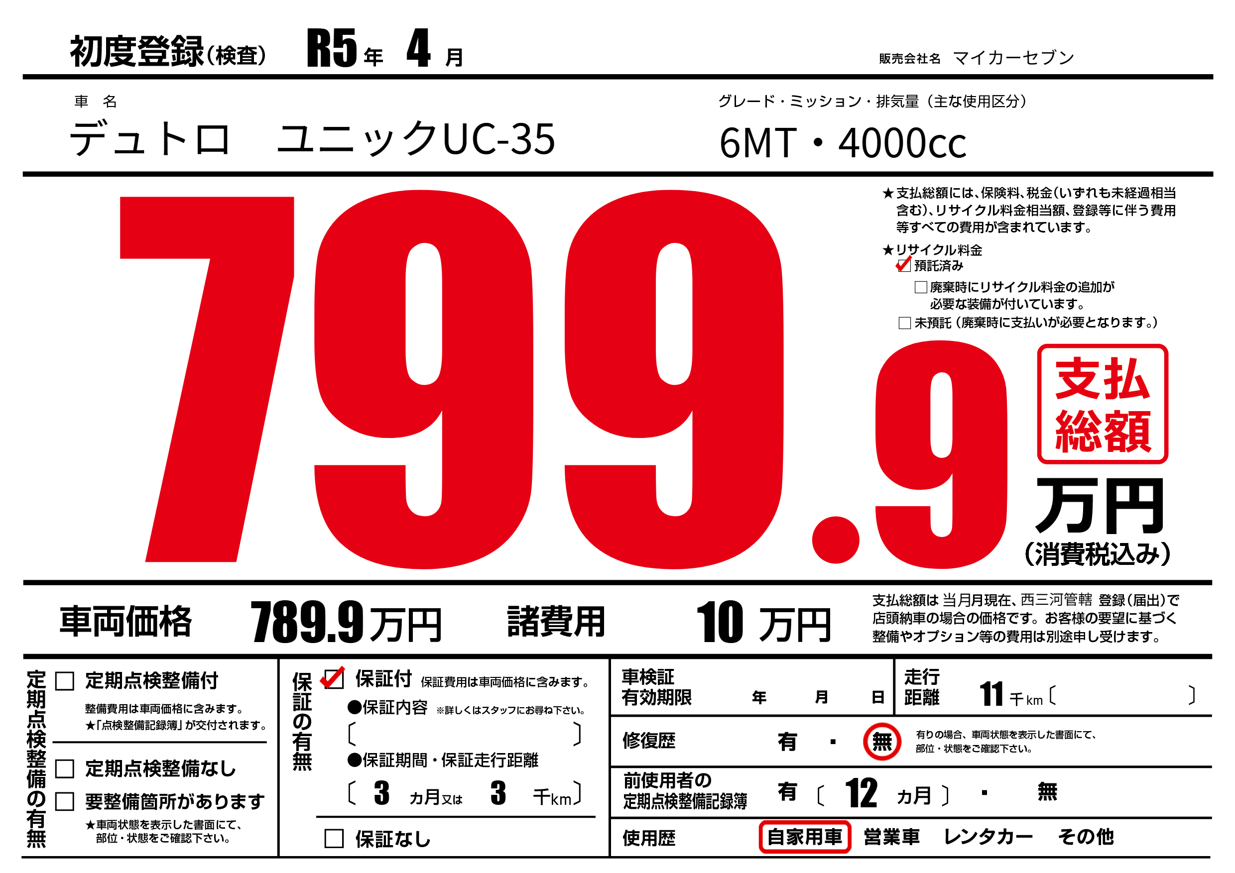 | 車名 | デュトロ ユニックUC-35 | グレード ミッション 排気量 |