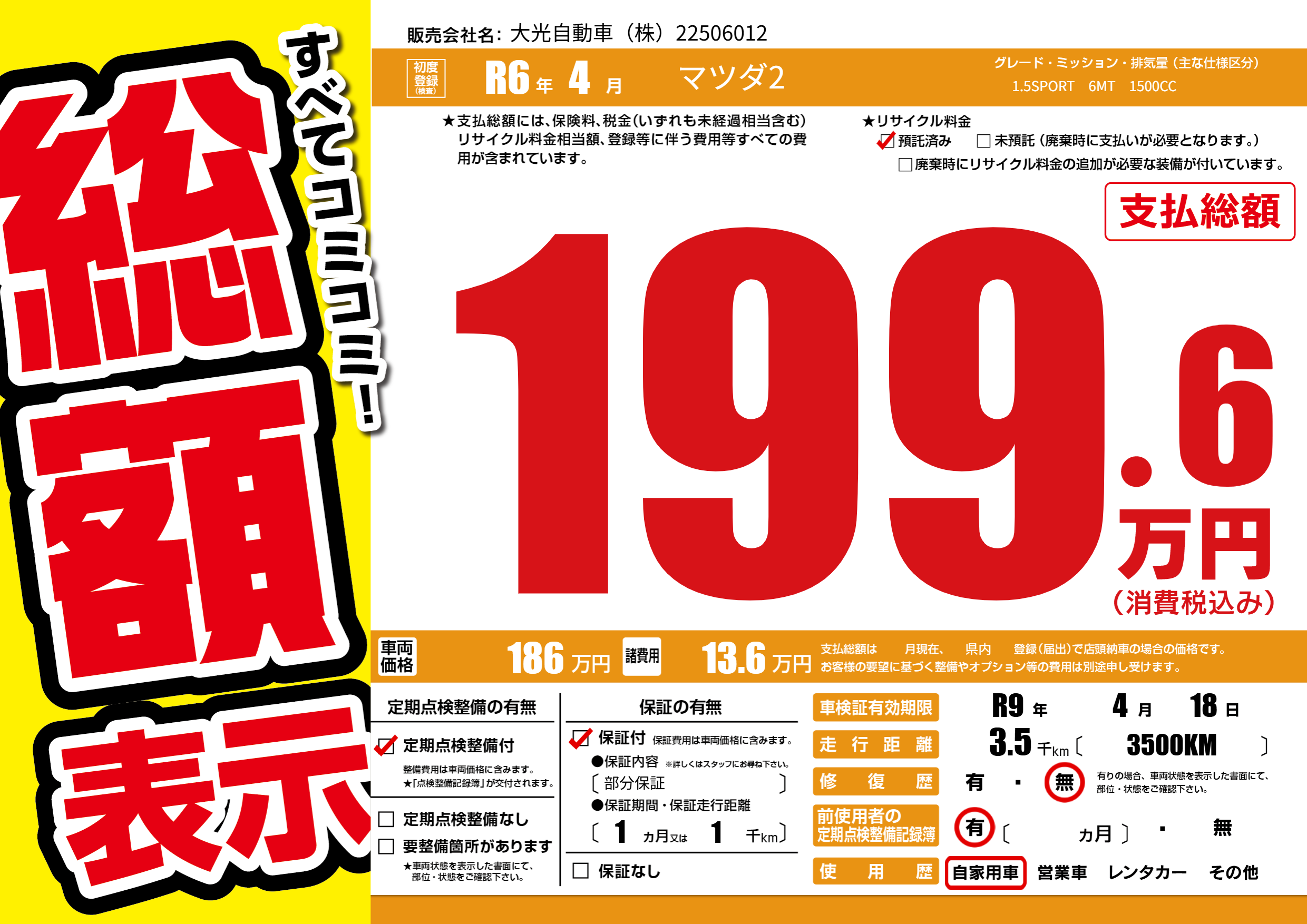 | 走行キロ | 0.3万km | 初年度登録 | R6年4月 |