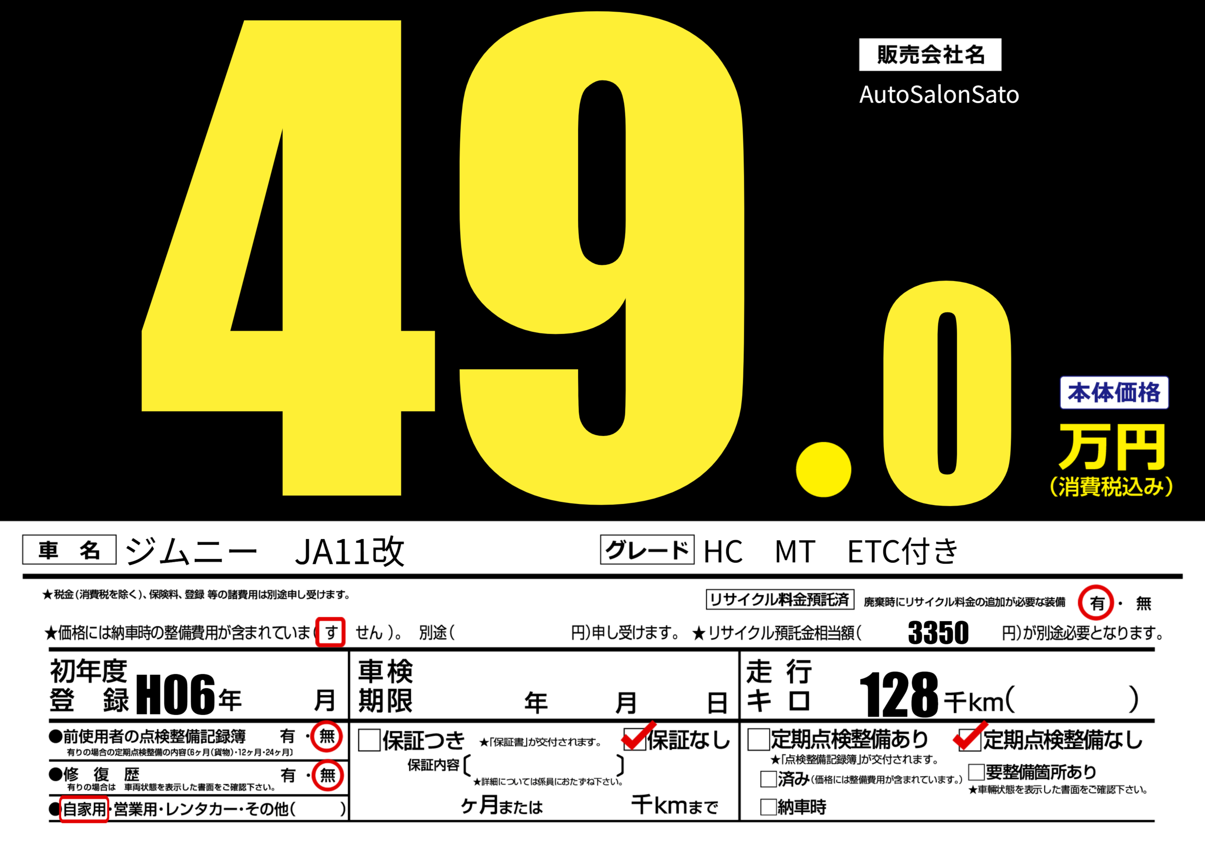 あり | リサイクル預託金相当額 | ( 3350円)が別途必要 |