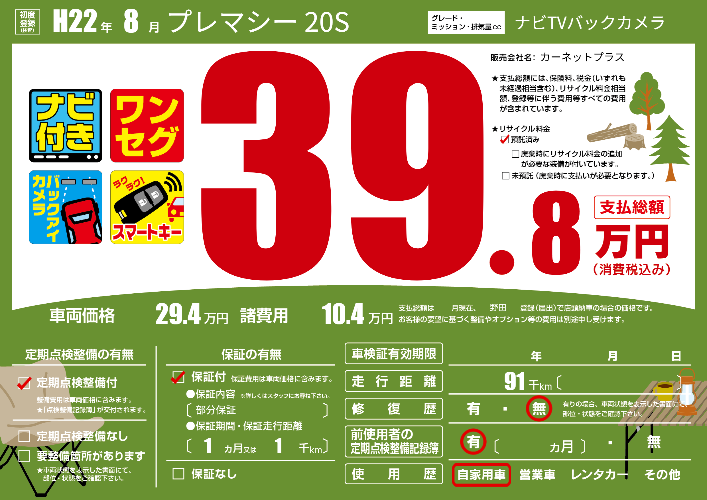 | 走行キロ | 9.1万km | 初年度登録 | H22年8月 |