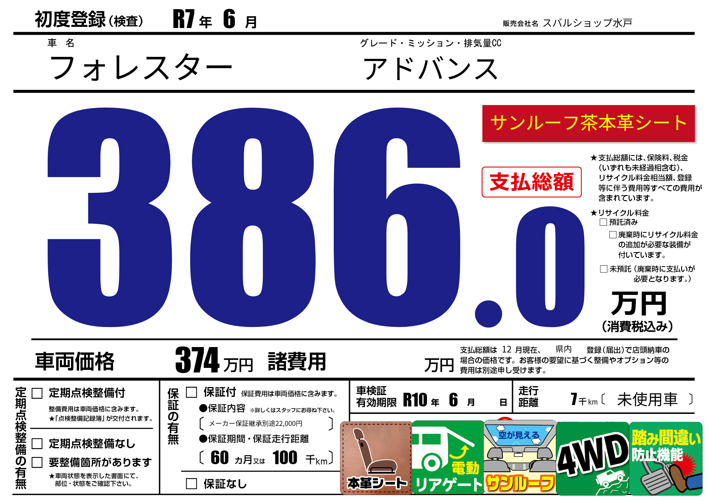| 車名 | フォレスター | グレード ミッション 排気量 |