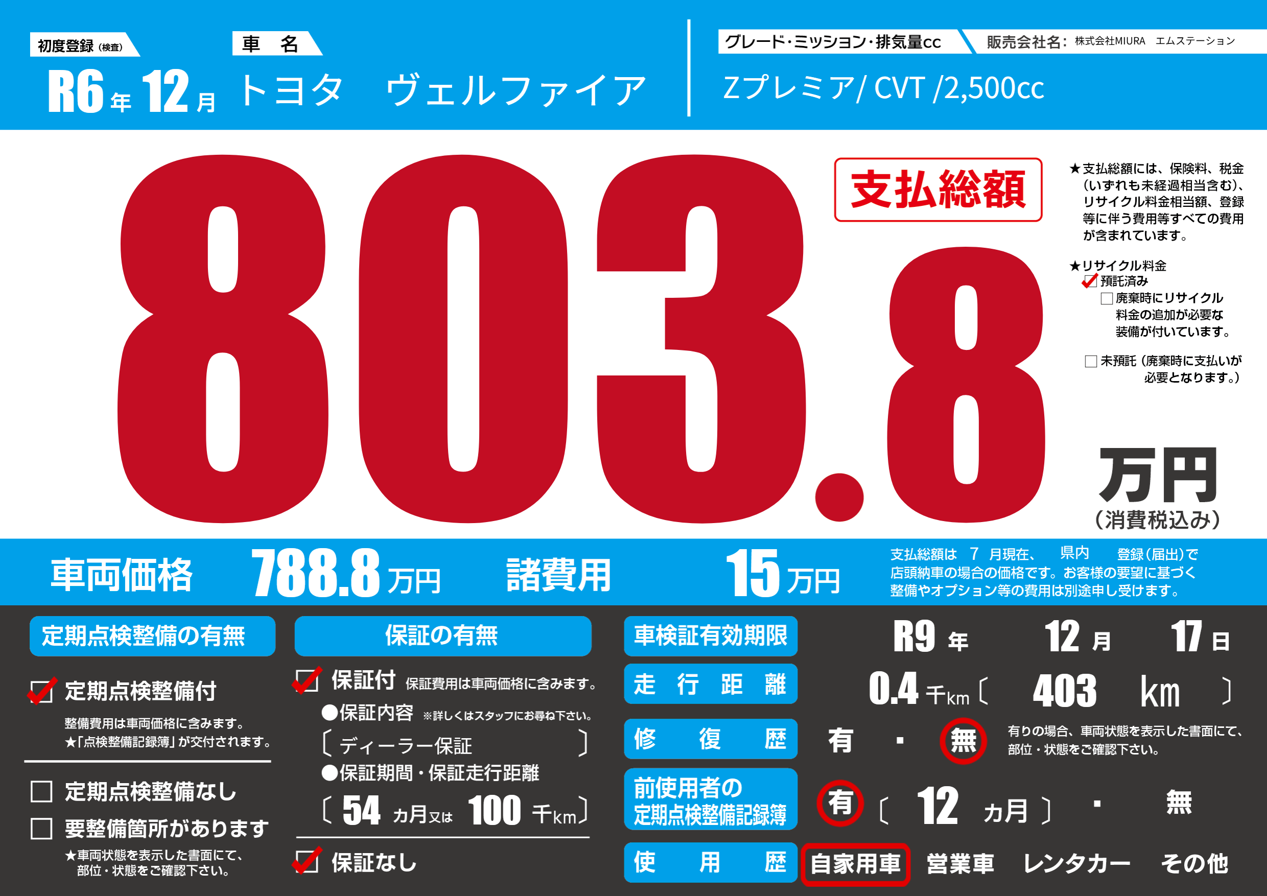 | 走行キロ | - | 初年度登録 | R6年12月 |