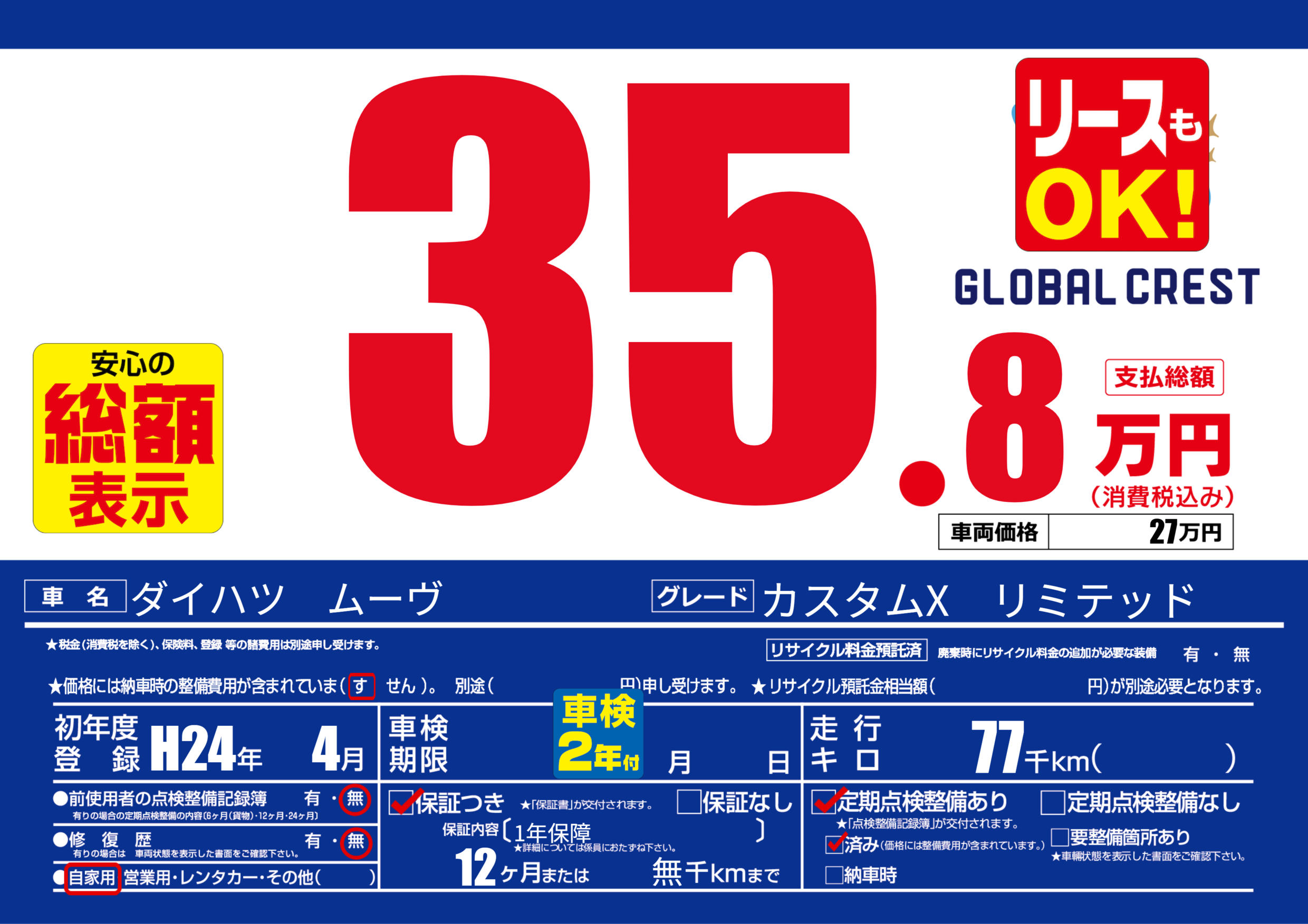 | 定期点検整備 | 定期点検整備あり 定期点検整備済み | ||