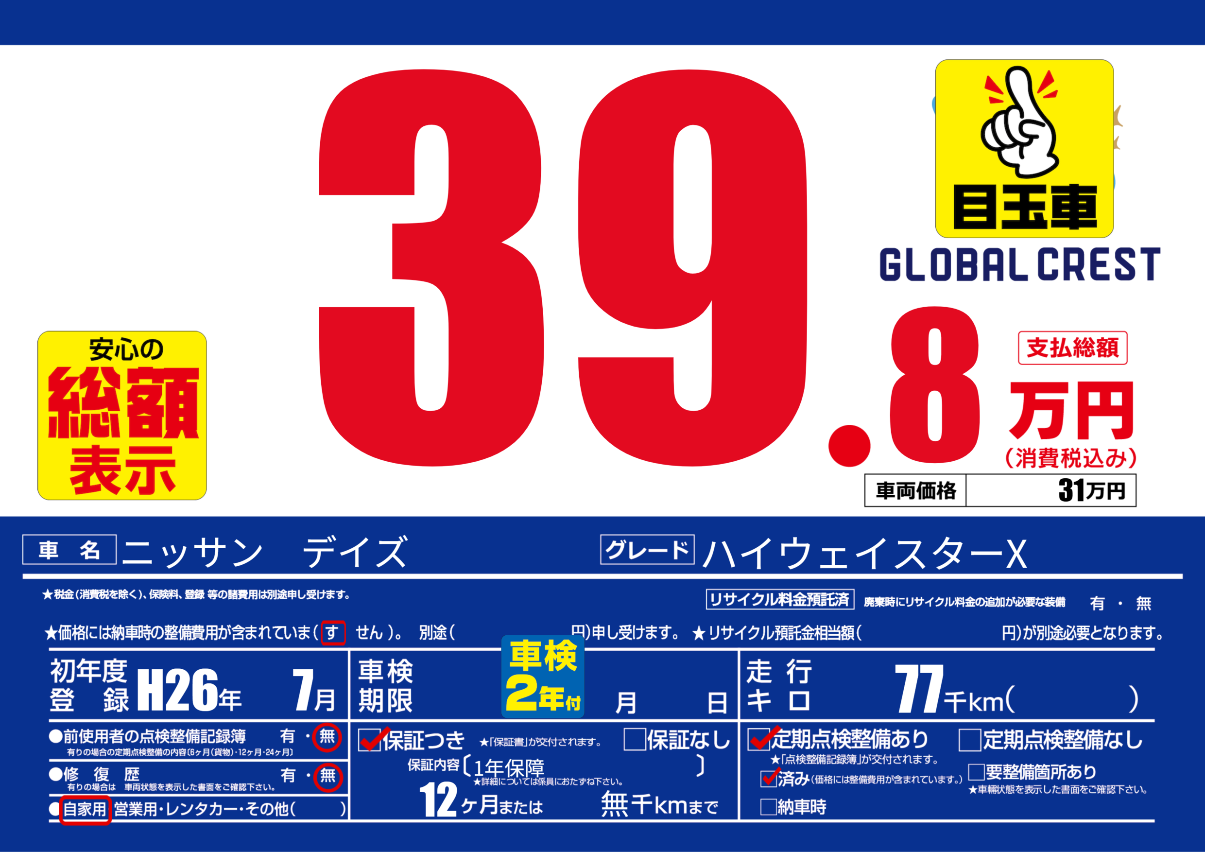 | 定期点検整備 | 定期点検整備あり 定期点検整備済み | ||