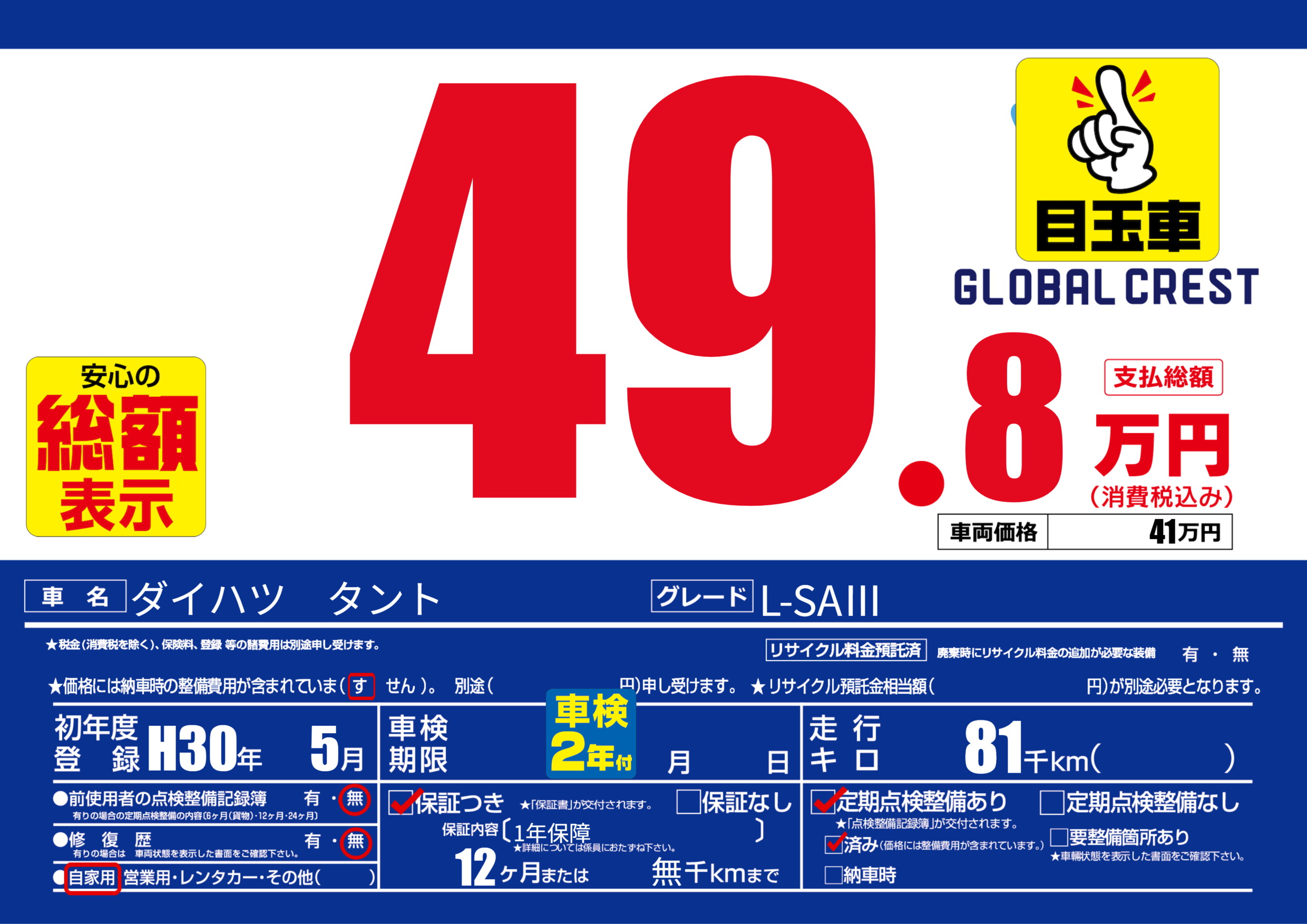 | 定期点検整備 | 定期点検整備あり 定期点検整備済み | ||