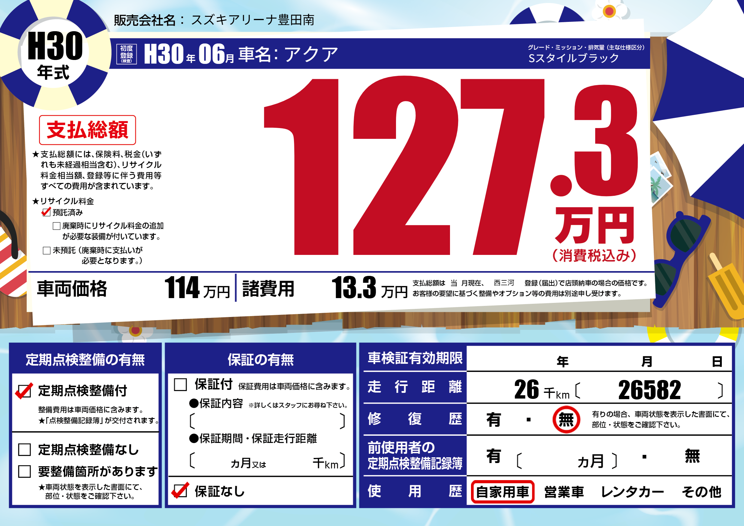 | 走行キロ | 2.6万km | 初年度登録 | H30年06月 |