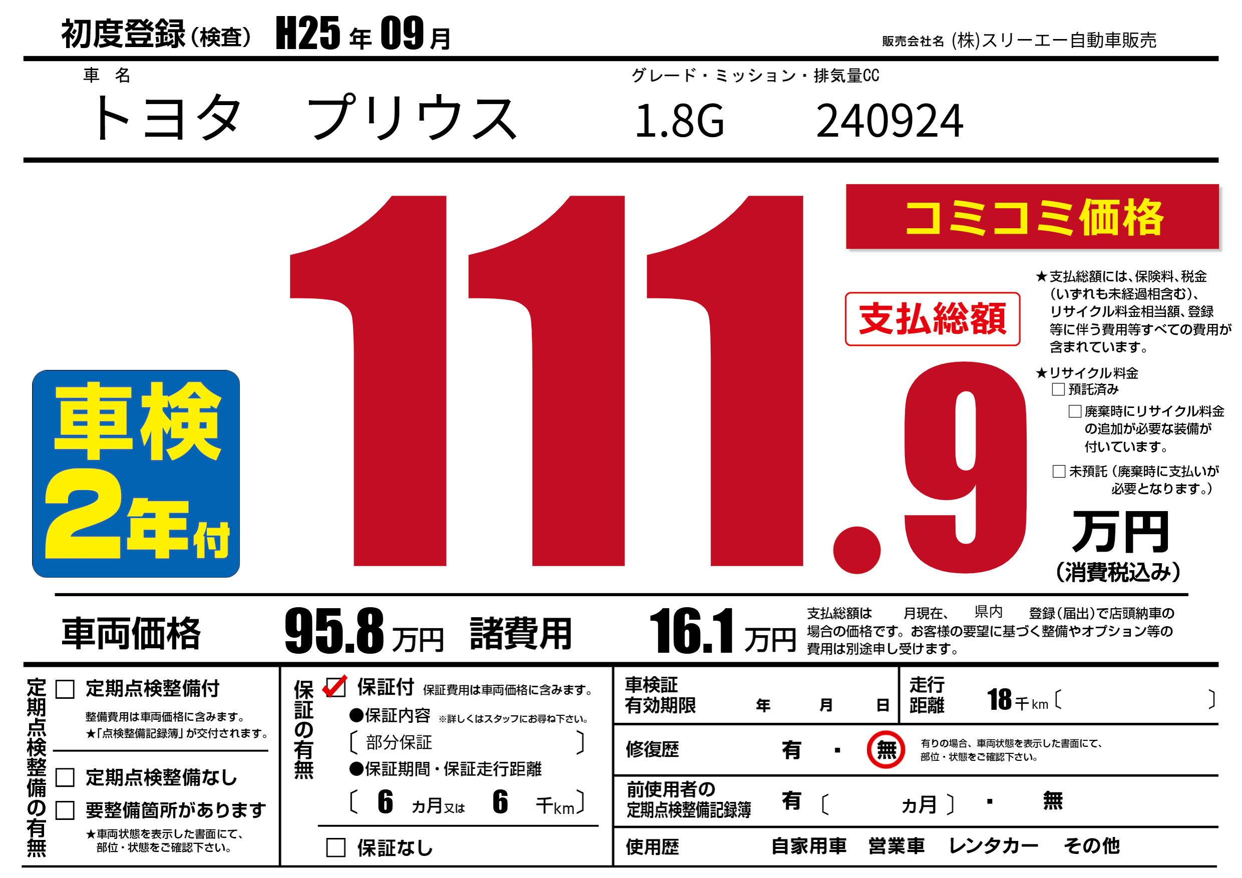 | 車名 | トヨタ プリウス | グレード ミッション 排気量 |