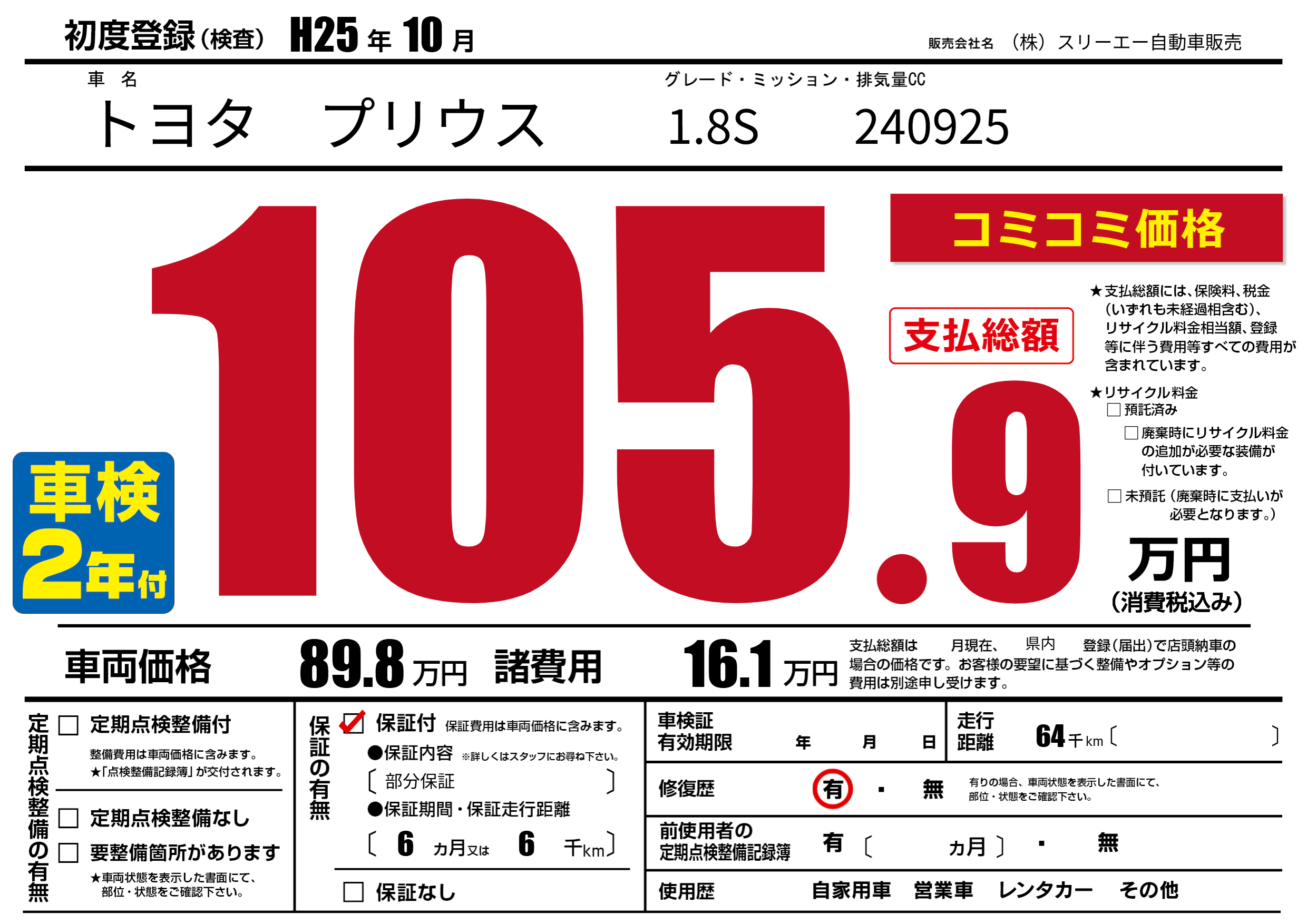 | 車名 | トヨタ プリウス | グレード ミッション 排気量 |