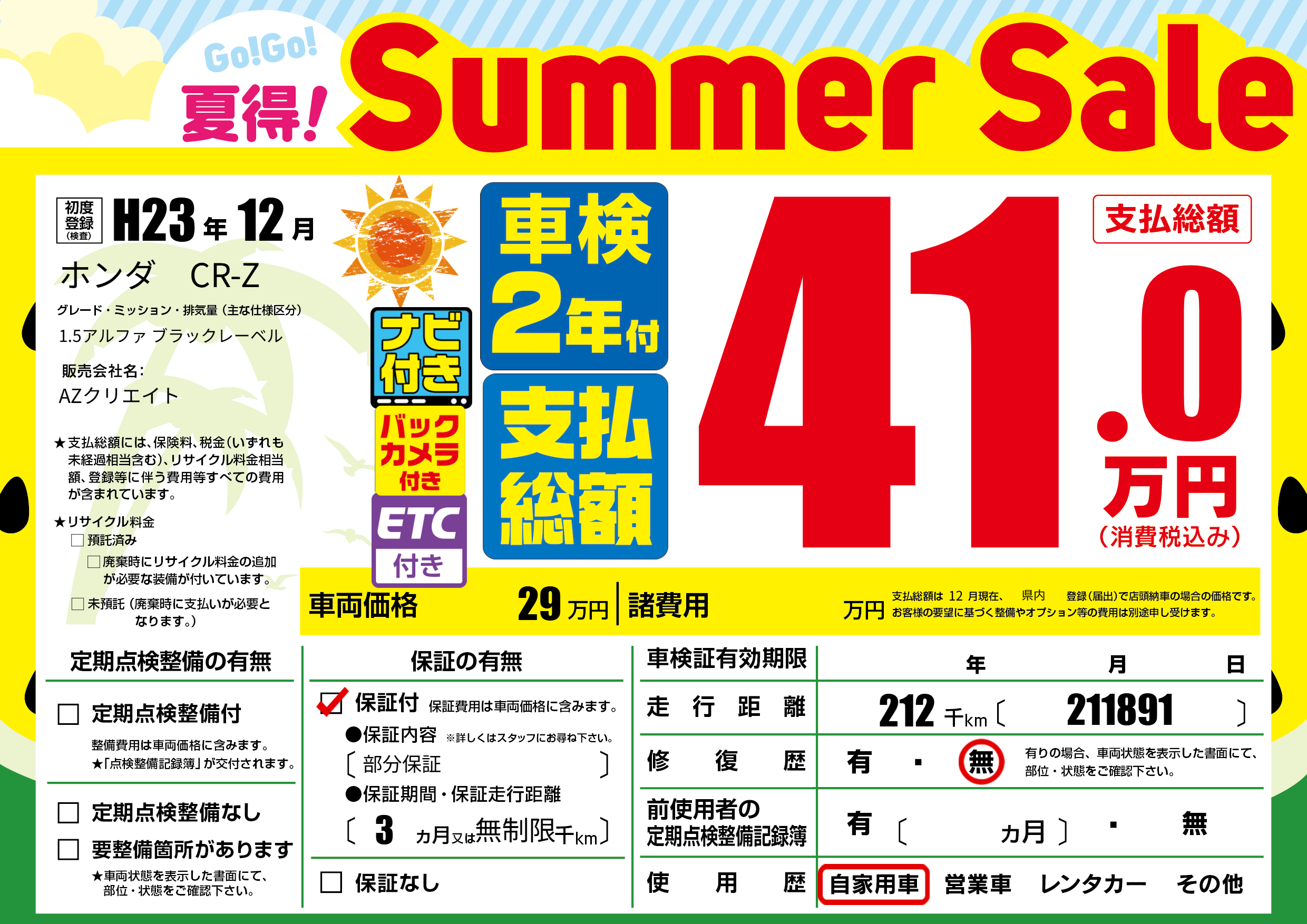 | 車名 | ホンダ CR-Z | グレード ミッション 排気量 |