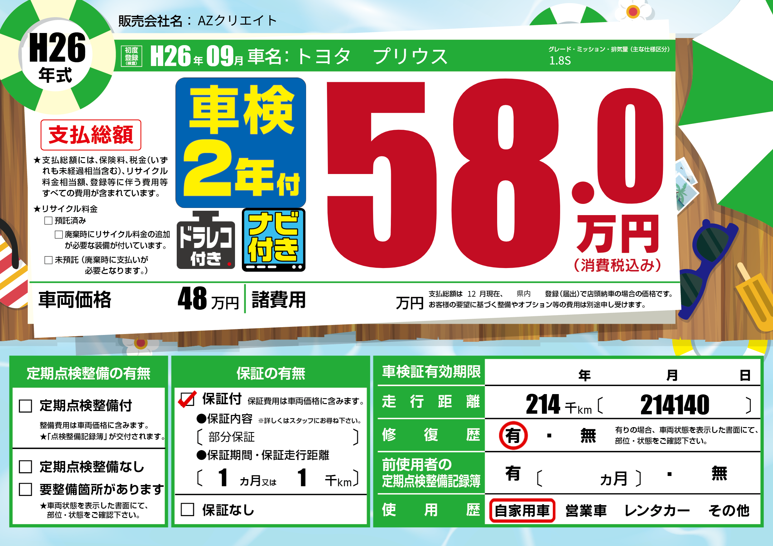 | 走行キロ | 21.4万km | 初年度登録 | H26年09月 |