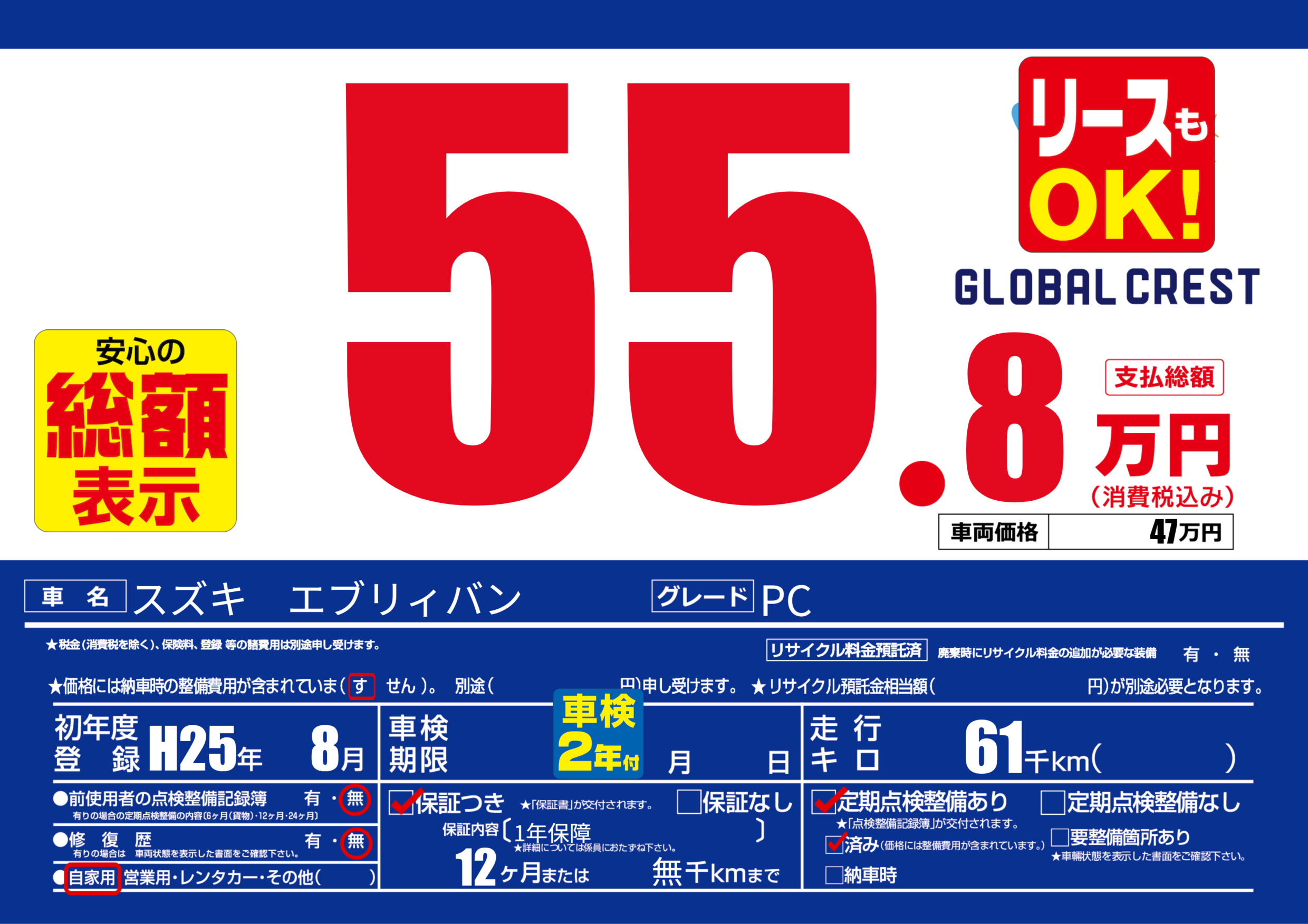 | 車名 | スズキ エブリィバン | グレード ミッション 排気量 |