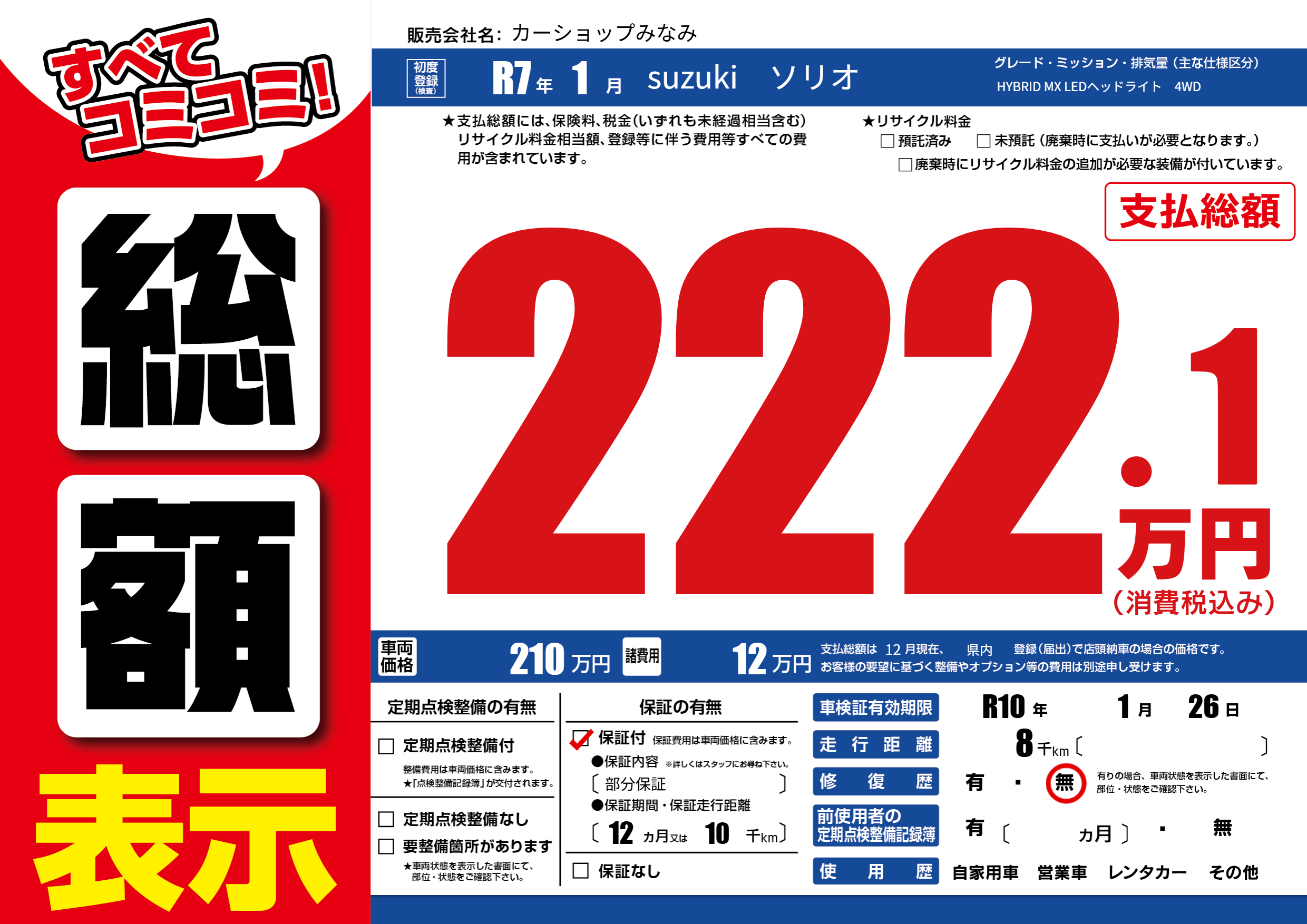 | 車検制限 | R10年 1月 26日 | ||