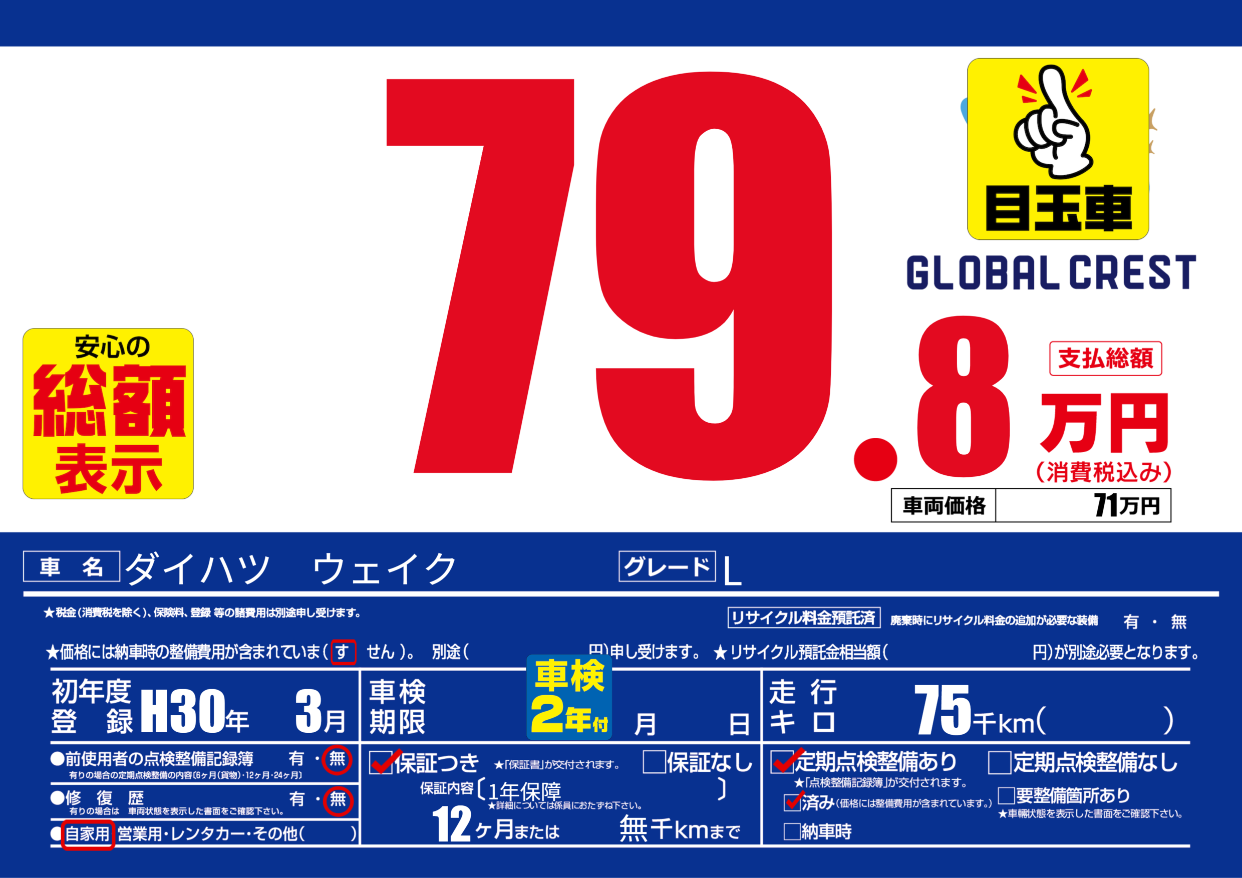 | 定期点検整備 | 定期点検整備あり 定期点検整備済み | ||