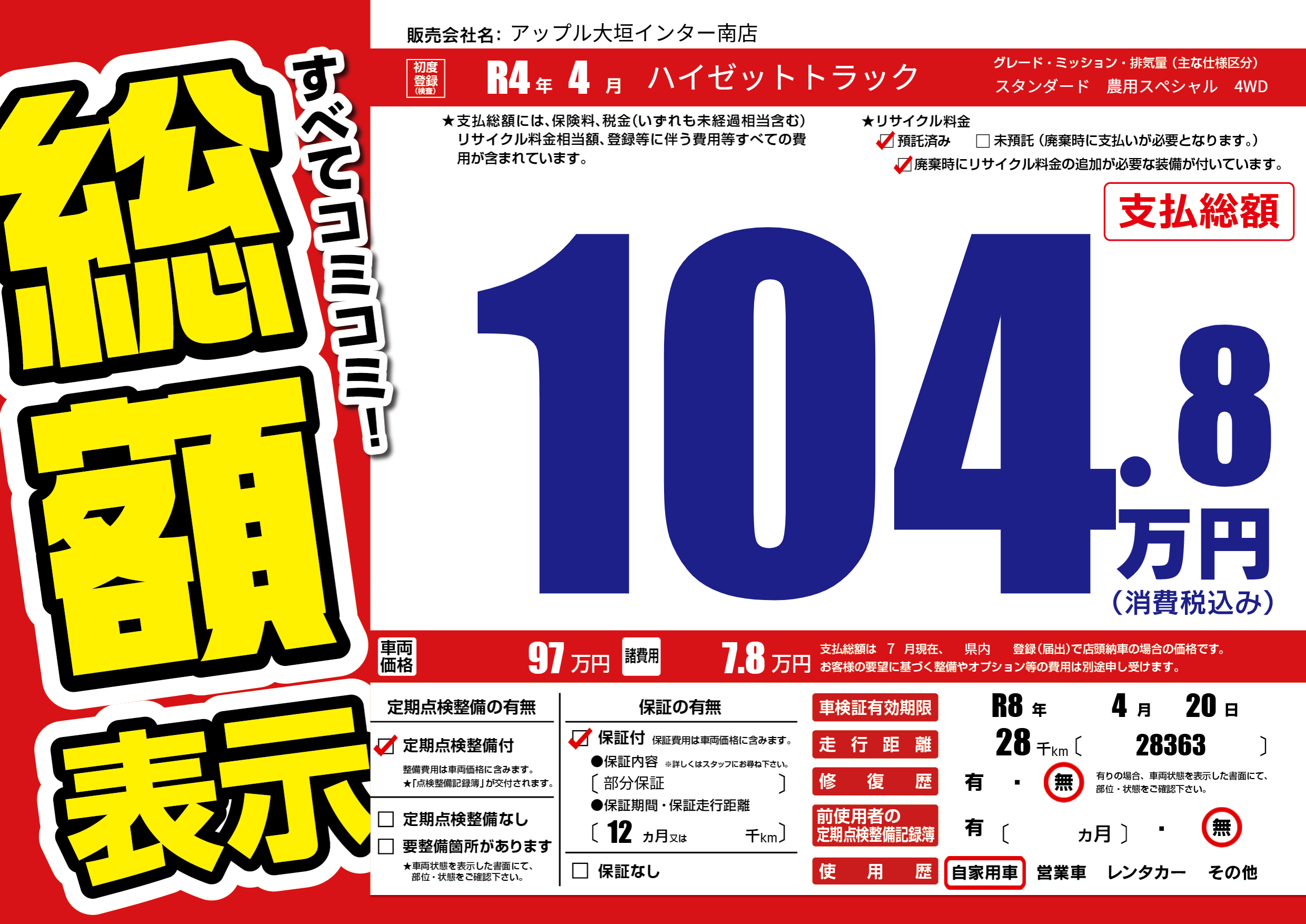 | 車検制限 | R8年 4月 20日 | ||