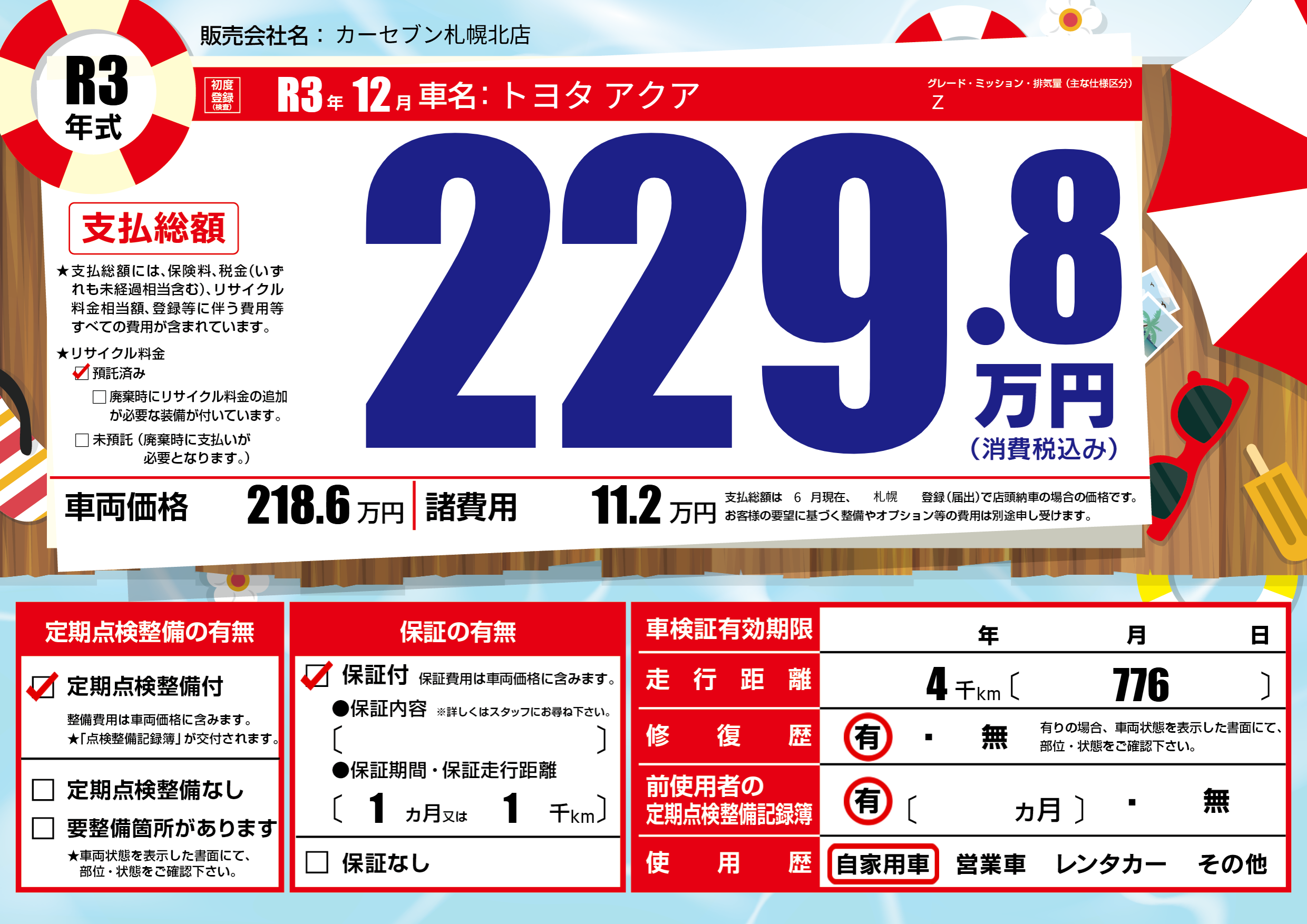 | 走行キロ | 0.4万km | 初年度登録 | R3年12月 |