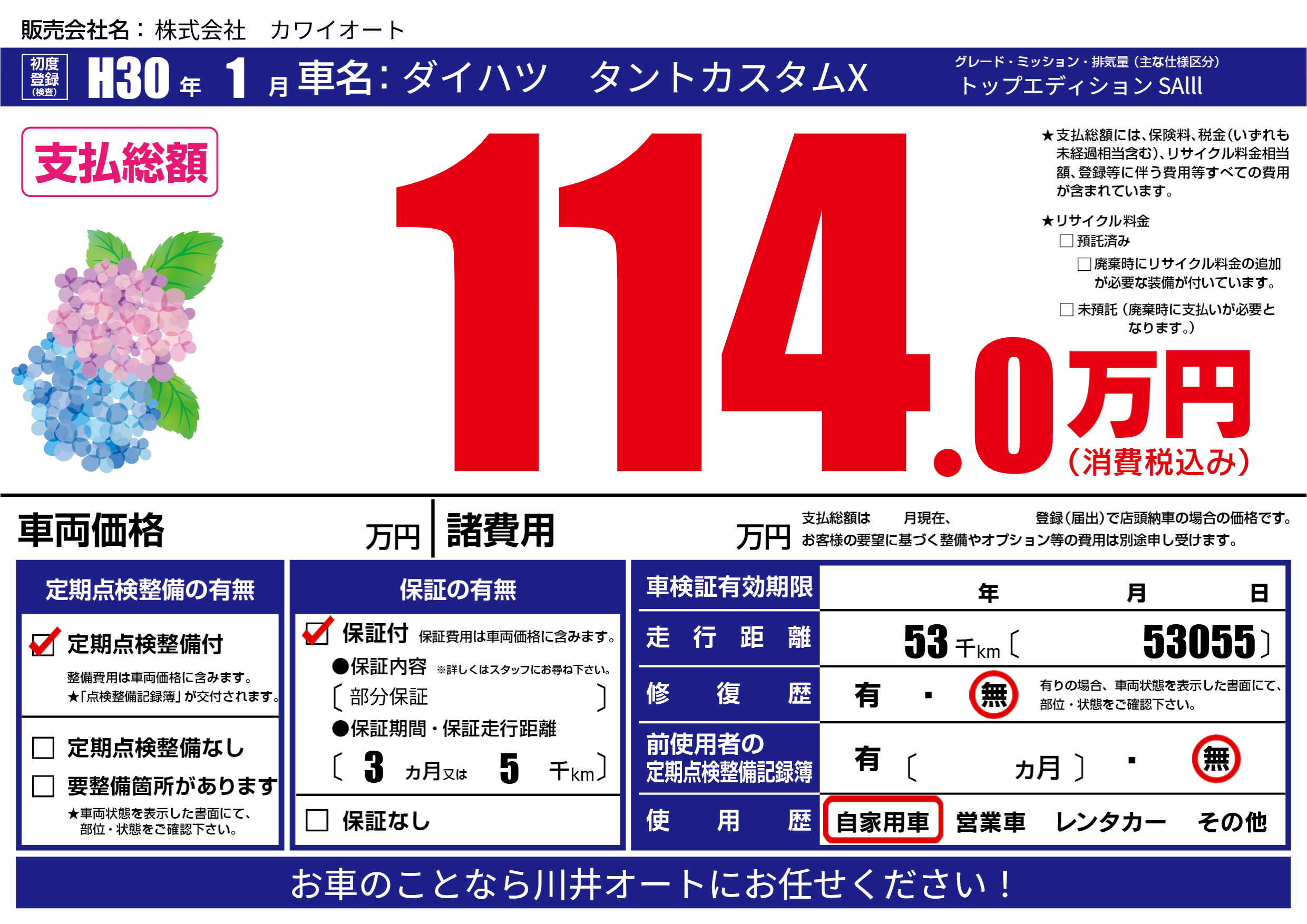 保証付き 保証内容(部分保証) 3ヶ月または(5)千kmまで |