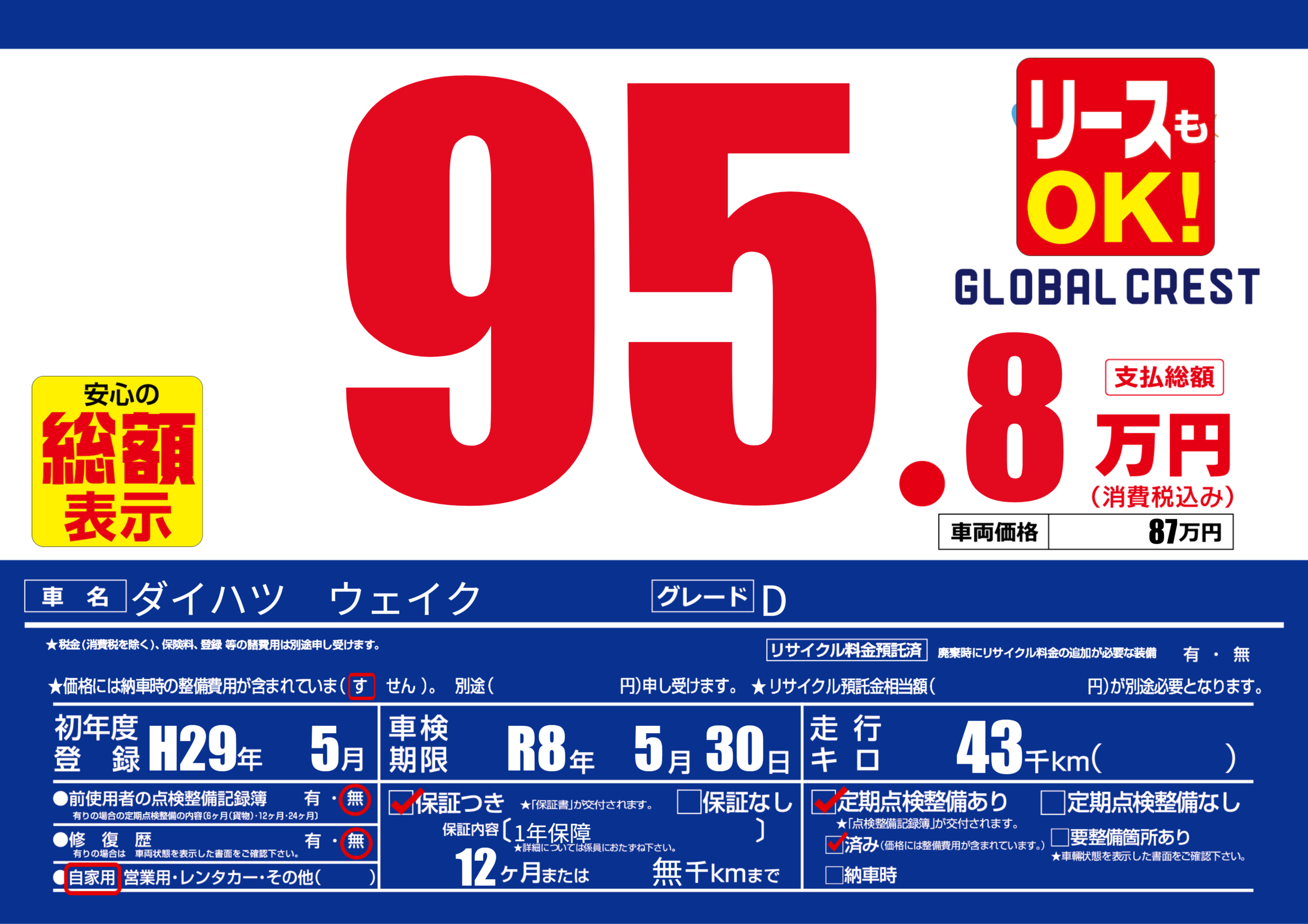 | 定期点検整備 | 定期点検整備あり 定期点検整備済み | ||