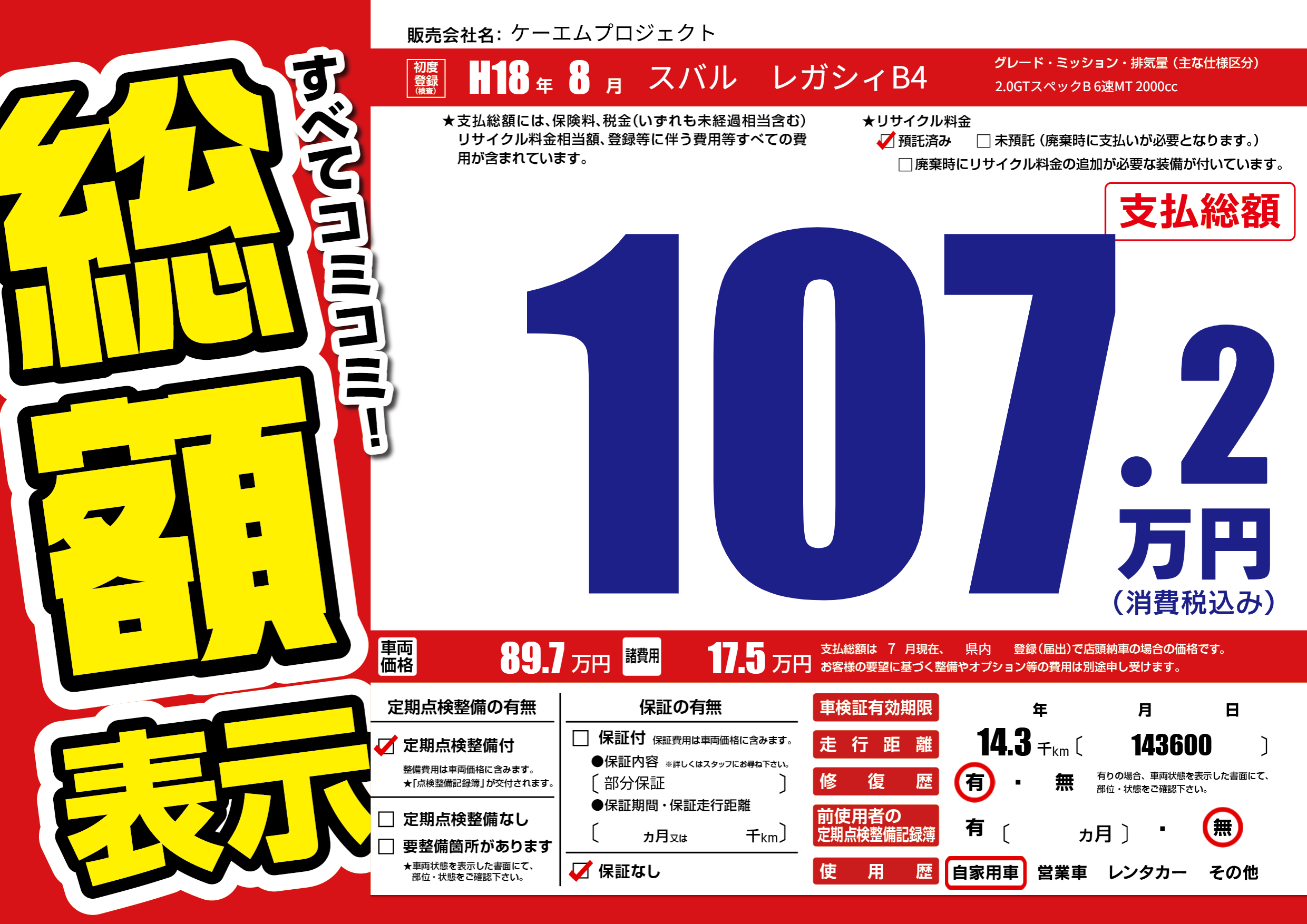 | 車名 | スバル レガシィB4 | グレード ミッション 排気量 |