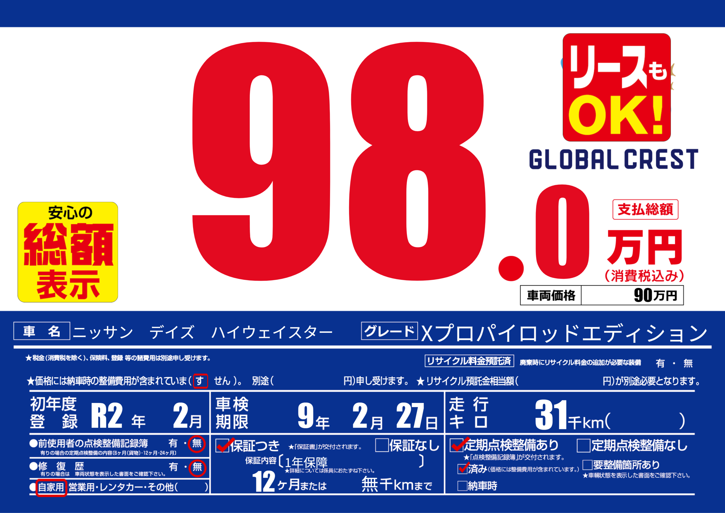 | 定期点検整備 | 定期点検整備あり 定期点検整備済み | ||