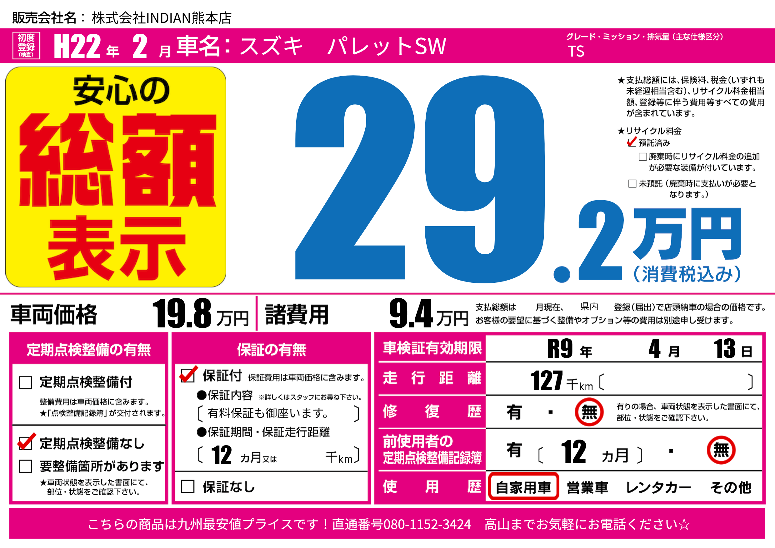 | 車名 | スズキ パレットSW | グレード ミッション 排気量 |