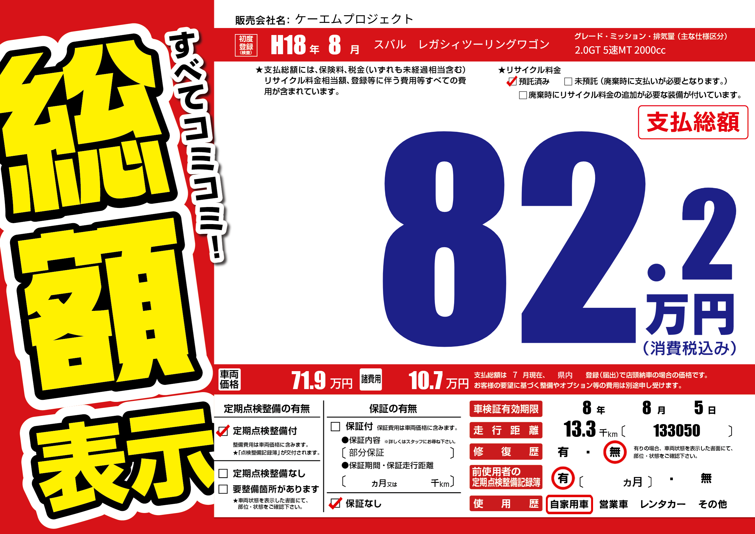| 車名 | スバル レガシィツーリングワゴン | グレード ミッション 排気量 |