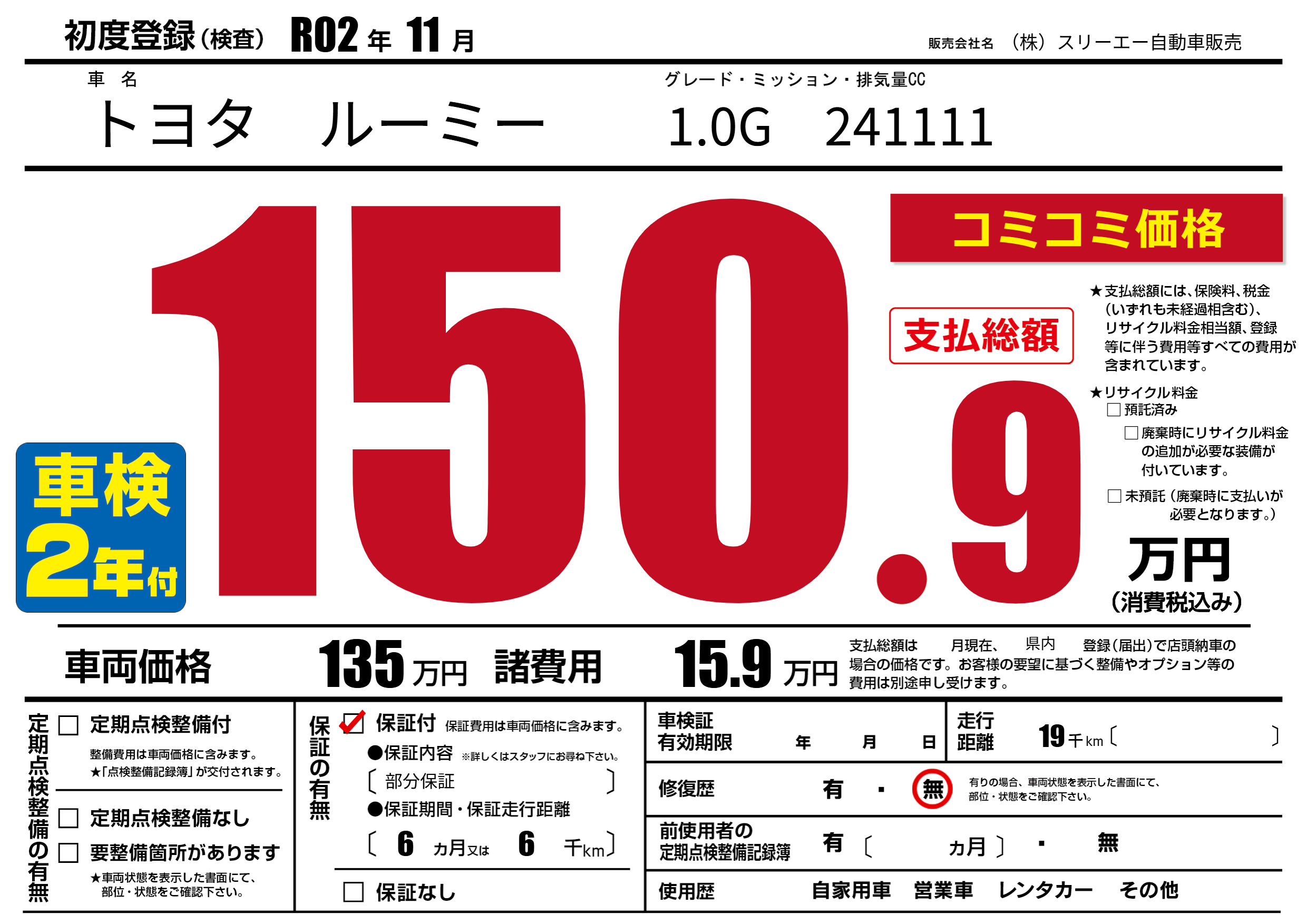 | 車名 | トヨタ ルーミー | グレード ミッション 排気量 |