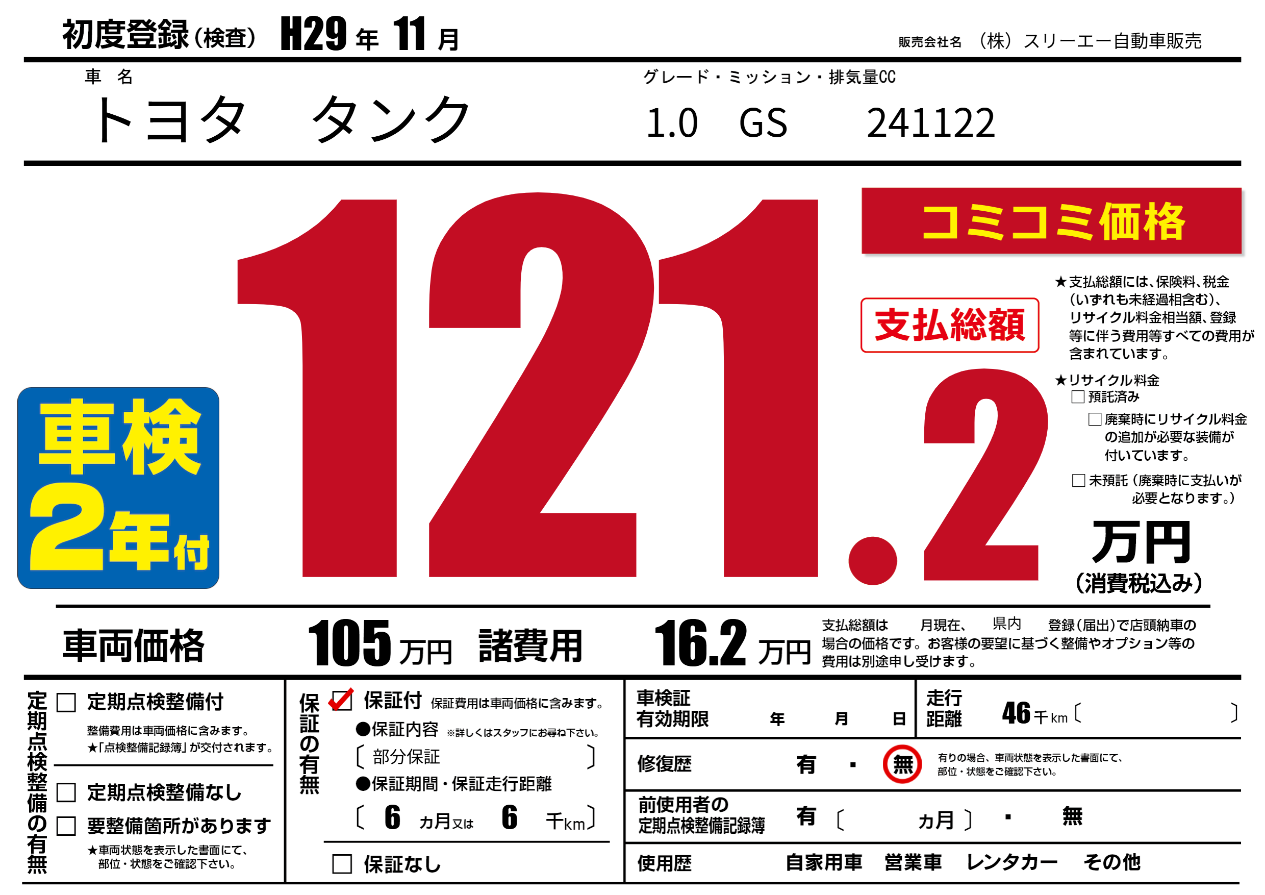 | 車名 | トヨタ タンク | グレード ミッション 排気量 |