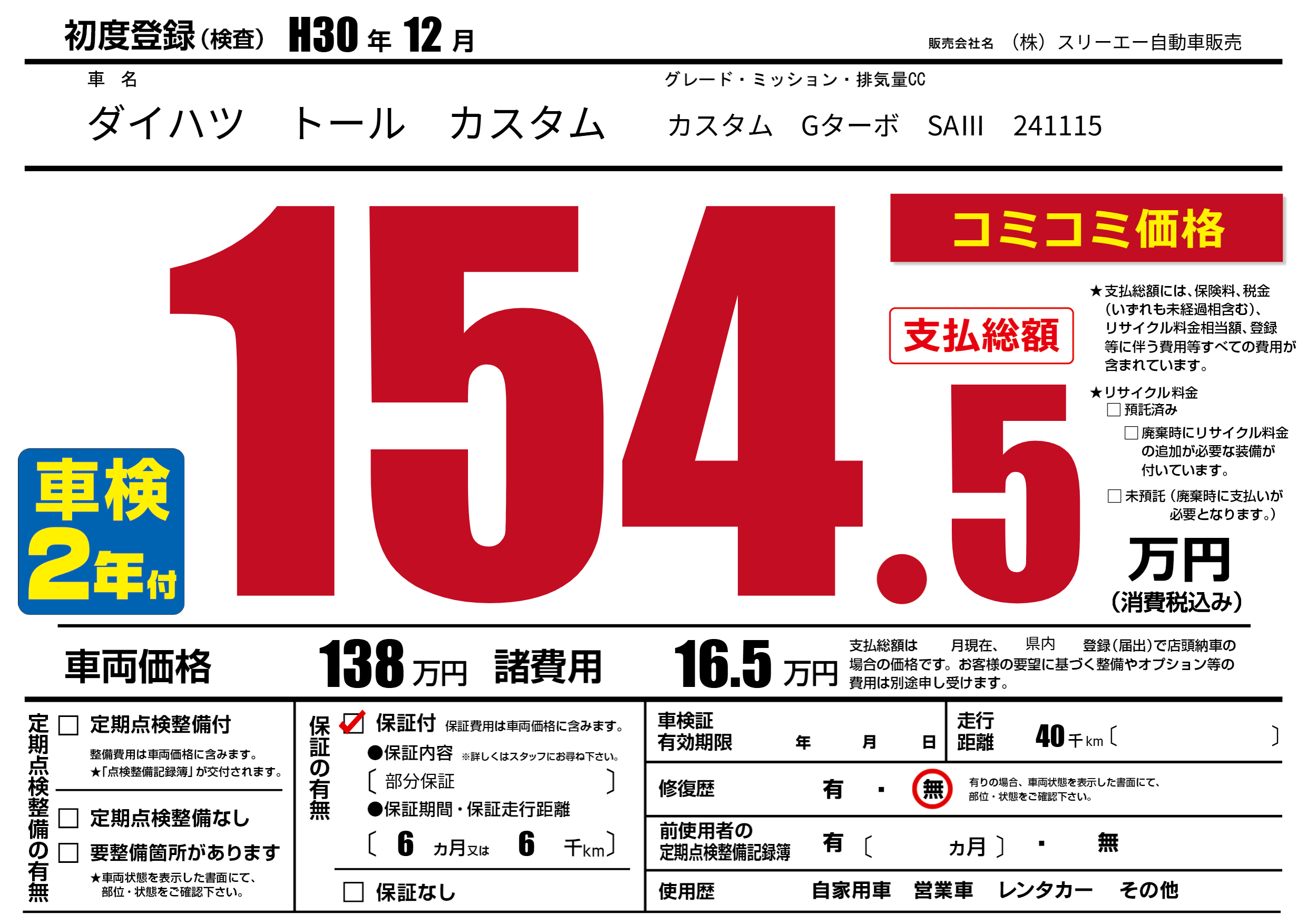 保証付き 保証内容(部分保証) 6ヶ月または(6)千kmまで |
