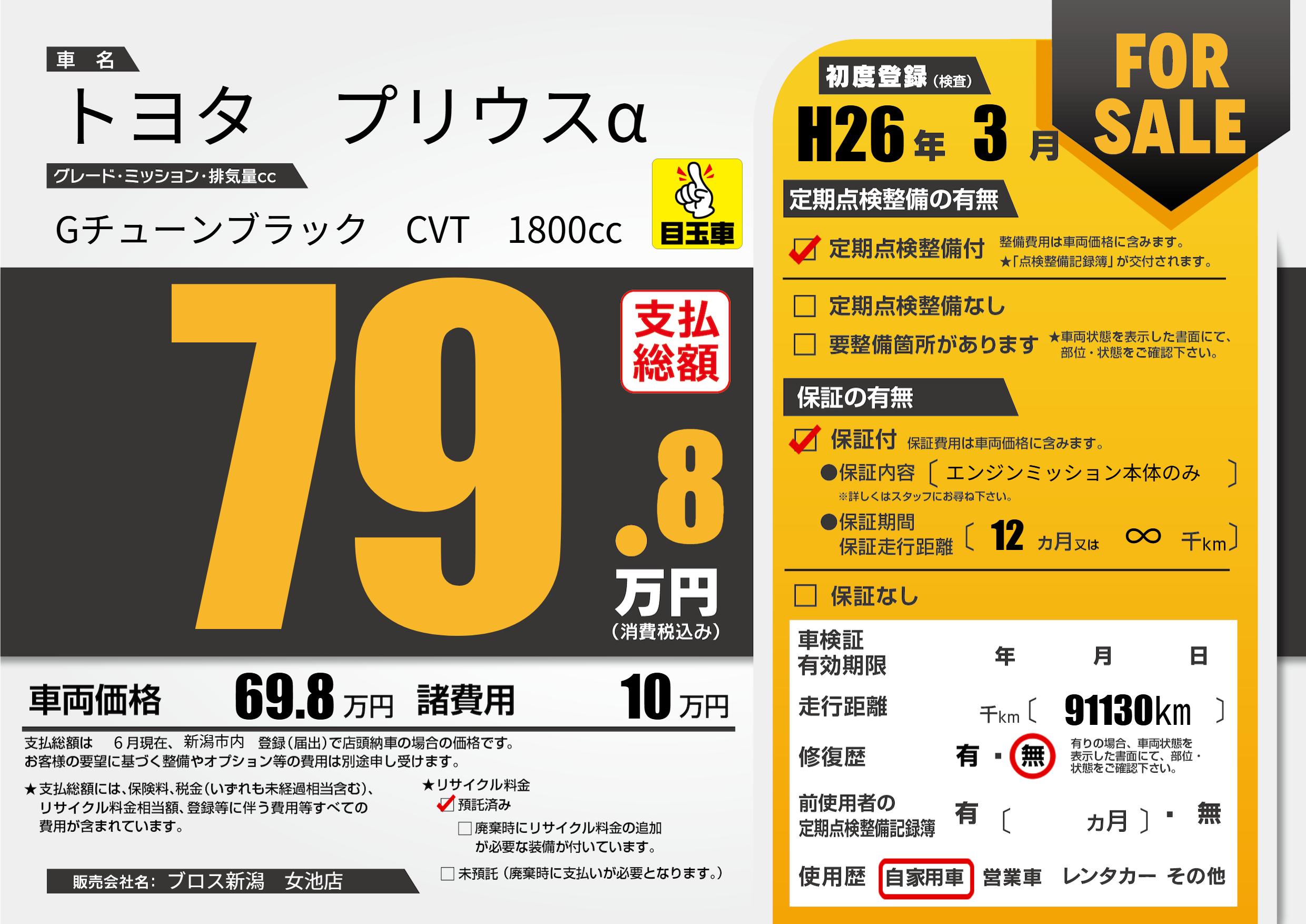 | 車名 | トヨタ プリウスα | グレード ミッション 排気量 |
