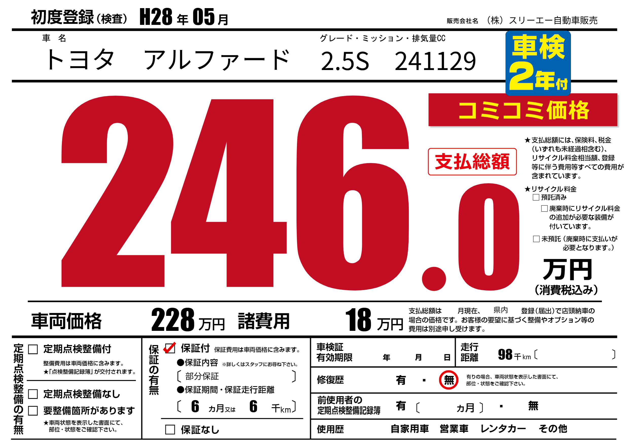 | 車名 | トヨタ アルファード | グレード ミッション 排気量 |