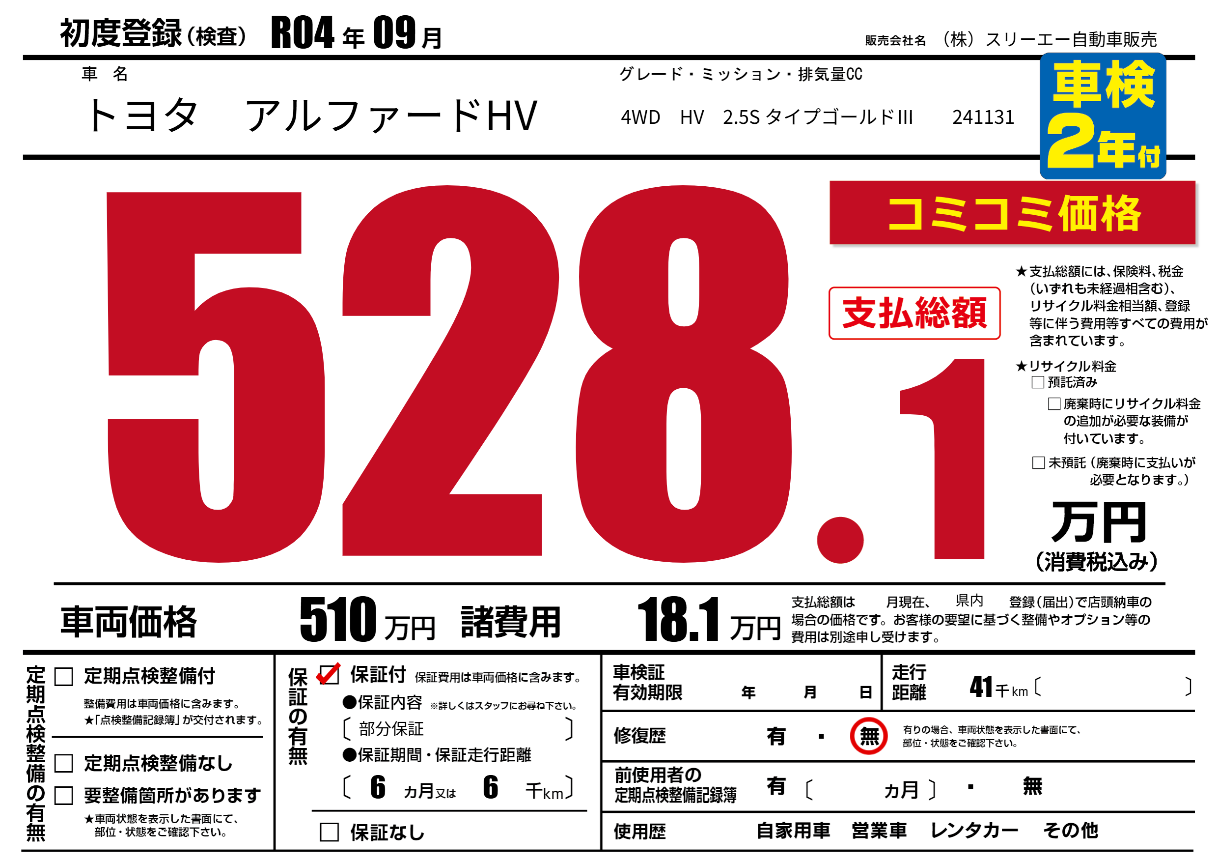 | 車名 | トヨタ アルファードHV | グレード ミッション 排気量 |
